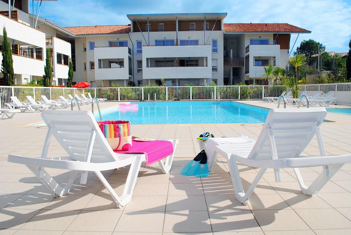Au pied du Golf et des plages : appt 3 pièces duplex 2 à 6 pers. avec séjour, cuisine équipée, salle d'eau avec WC, chambre lit double, cabine 2 couchages, sdb avec WC. Actuellement en travaux : façade et peintures extérieures. Le plus : TV, Wifi, lave-vaisselle, piscine chauffée (selon saison) activités de loisirs (golf, surf, vélo). Linge de lit sur demande (sup. 40€). Terrasse vue pinède, parking gratuit. La résidence se situe au coeur de la pinède avec vue sur le golf et accès à la plage.