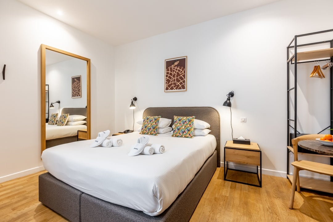 Velkomin í herbergið þitt, hannað til að sameina þægindi, glæsileika og hagnýtni í hjarta Parísarborgar. Staðsett á fullbúnu enduruppgerðu hönnunarhóteli. Einföld og nútímaleg skreytingin, sem er trúum heimi hótelsins, skapar róandi og hlýlegt andrúmsloft sem er fullkomið fyrir vel heppnaða dvöl í París.