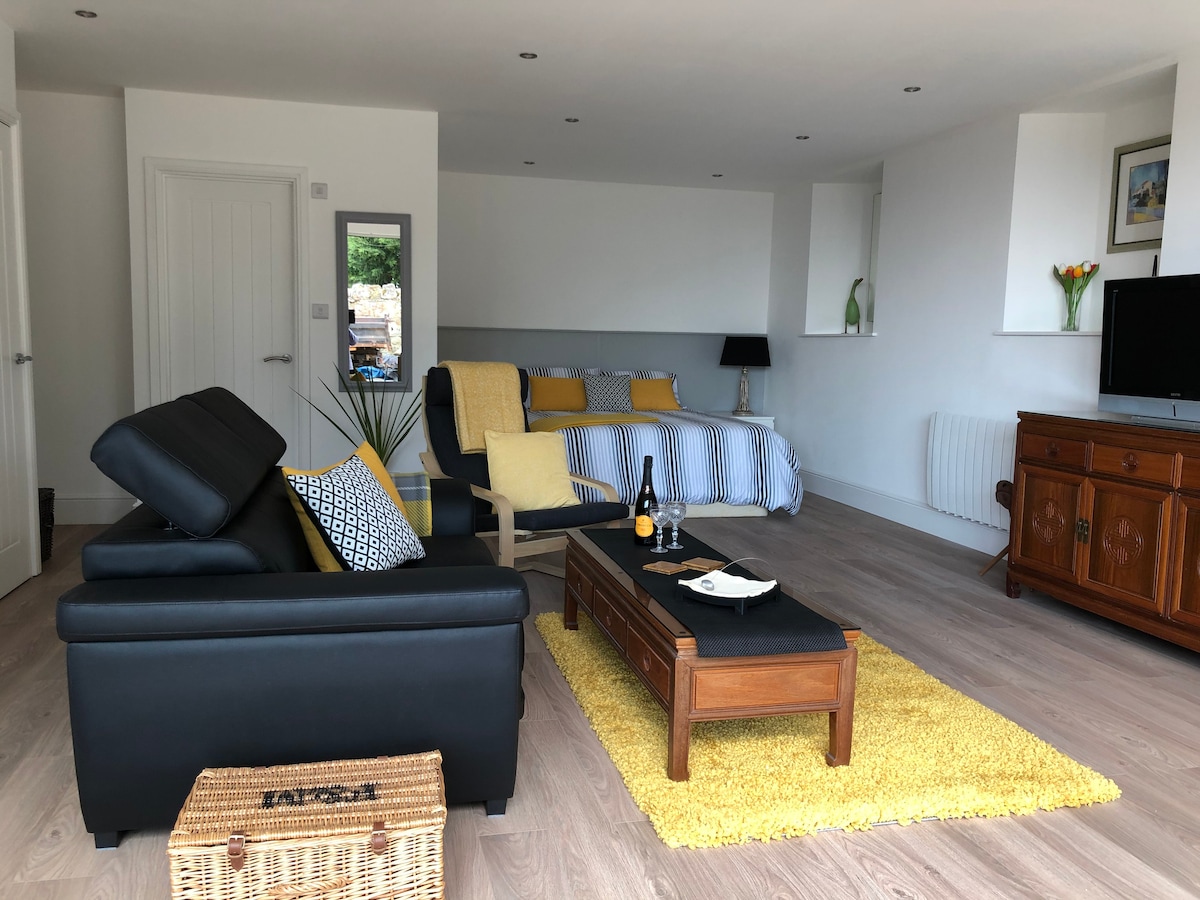 A tasteful studio apartment suitable for 2 adults. A few minutes walk from the coastal footpath and a short drive from Ventnor Town Centre. This luxurious studio offers a clean modern interior whilst retaining the exterior character and charm of the original property. A bright sunny area with a super king size bed, lounge with leather sofa, well equipped kitchen and modern bathroom with walk in shower. A private garden with sea views and a selection of garden furniture with BBQ.