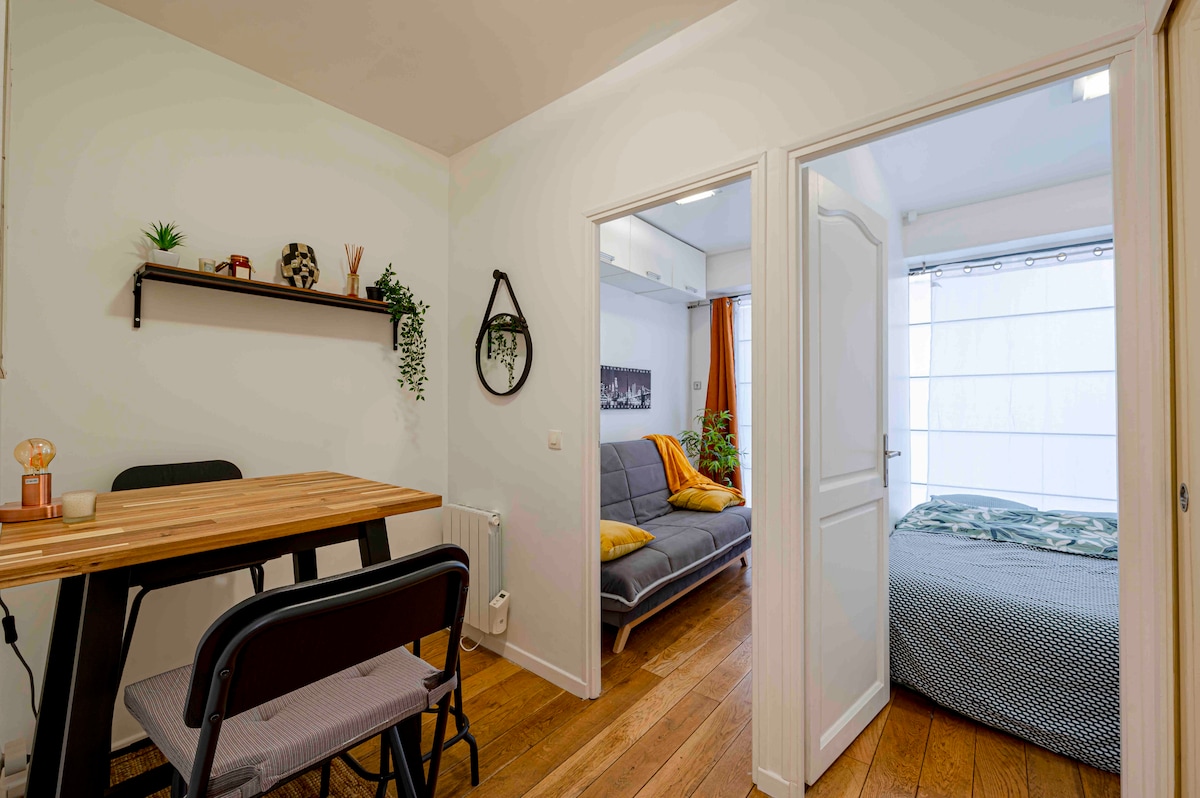 Cosy studio (27 sqm) in an lively and cosmopolite neighborhood located in the north center of Paris, in a building from 18th century. Staðurinn er rólegur þar sem stúdíóið er við hliðarinnar, á 1. hæð (2. hæð í Bandaríkjunum) Lýsing : - stofa með sófa, - opið eldhús - svefnaðstaða - aðskilið baðherbergi með stórri sturtu og salerni Handklæði eru til staðar en þeim er ekki skipt út meðan á dvölinni stendur Aðeins er boðið upp á eina sæng/teppi Líkamsgel og sjampó fylgir ekki