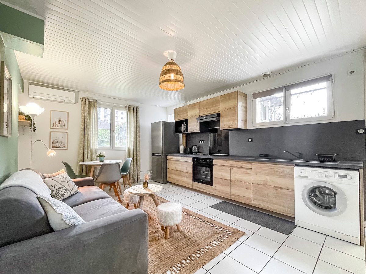Þetta notalega stúdíó er staðsett í vistvænu hverfi með óhefðbundnum arkitektúr og býður upp á öll þægindin sem þú þarft í björtu 18m2 hverfi, umkringt gróðri og nálægt þægindum þéttbýlis. Þjónað með SPORVAGNI D (bein lestarstöð og Chu) + línur C6, C7 og 12. Line C7 er beint að háskólalóðinni á 11 mínútum. (stöðva Étienne Grappe) Staðsett við útgang 4 í Rocade, aðgengi er fljótlegt og auðvelt alls staðar á stórborgarsvæðinu. Ókeypis bílastæði í nágrenninu