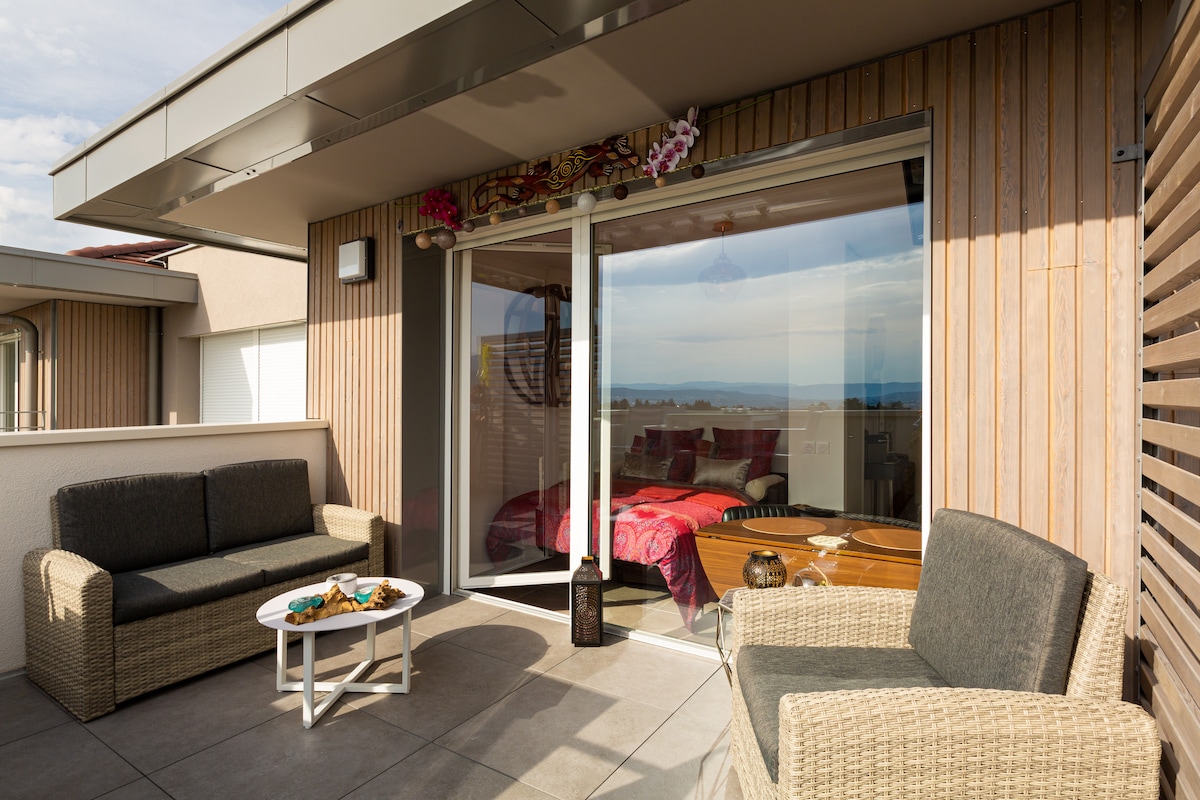Við bjóðum þig velkomin (n) í heillandi stúdíó okkar í Attica, hljóðlátu, frábærlega staðsett í nýju og öruggu húsnæði í hæðunum í Annecy . Stúdíóið okkar „ Le Panorama “ er þægilegt gistirými með vönduðu og nútímalegu andrúmslofti sem fylgir viðskiptaferð eða gistingu á staðnum. Hlýlegt og notalegt andrúmsloft. Stórkostlegt útsýni yfir vatnið, fjallahringinn og borgina Annecy býður þér upp á einstaklega fallegt umhverfi.