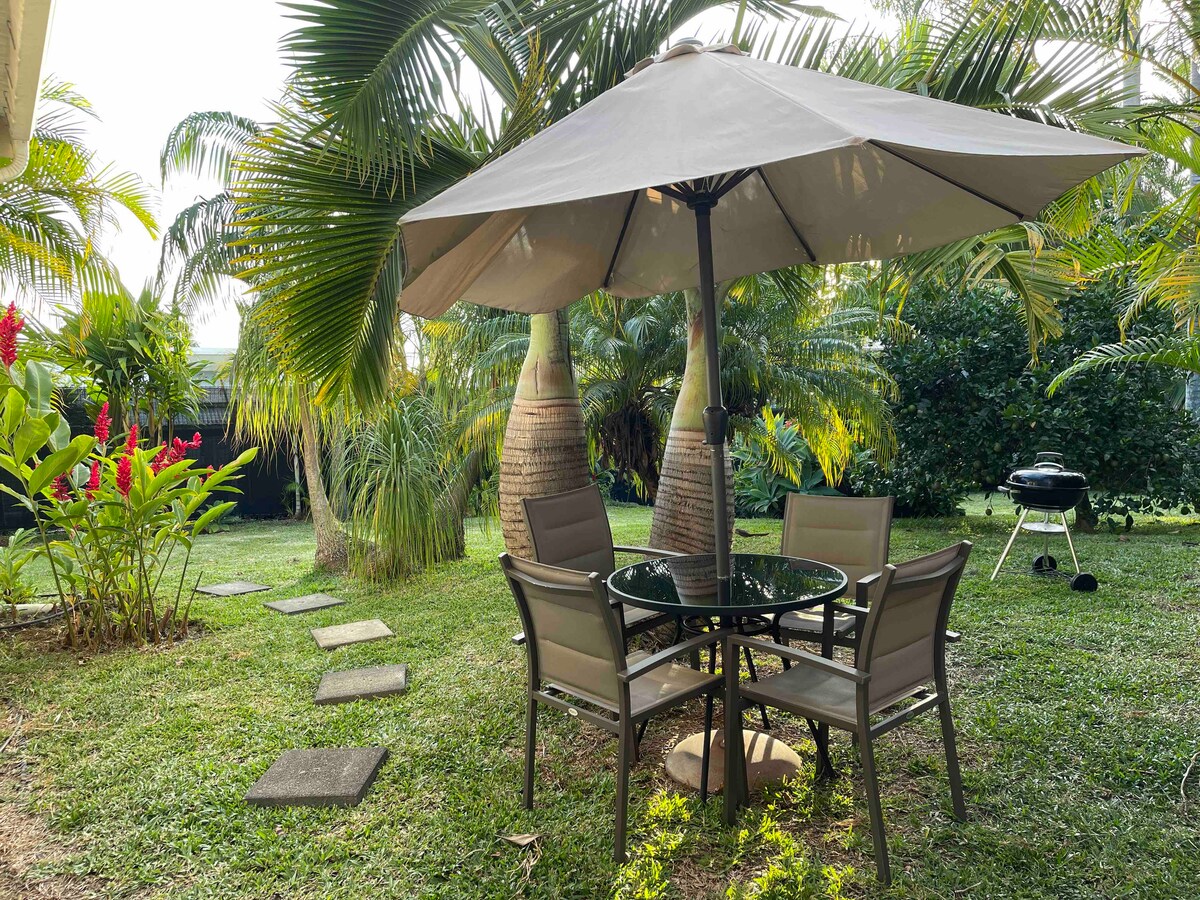 Quiet detached T2 in Saint-Pierre (Ligne des Bambous), nestled in a lush tropical garden. Heated saltwater pool shared only with the owners, Hervé & Sandrine (no other guests). Private parking, Wi-Fi, dining area. Two 160 cm queen-size beds, hotel comfort, spotless and well cared for, very comfortable bedding. Ideal for 2 to 4 guests (family or two couples). Perfect base for beaches, hikes and the Wild South.