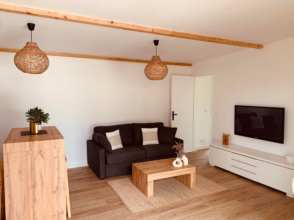 Einstök og óhefðbundin gistiaðstaða sem flokkuð eru 5⭐️⭐️⭐️⭐️⭐️, hljóðlát og fáguð, staðsett í hjarta Mussidan. Það er stór 80 m² risíbúð á jörðinni, undir háaloftinu (53 m² lög um Carrez). Þú munt tæla þig með sjarmanum á háaloftinu með húsgögnum. Svefnherbergið er opið heimilinu. - 4 fullorðnir + 1 barn (1 hjónarúm, 1 Rapido svefnsófi og 1 regnhlífarrúm) - Eldhús með húsgögnum - Sjónvarp - Trefjar - Lök, handklæði og rúmföt - Ókeypis bílastæði - SNCF stöð í 850 metra fjarlægð - Minna en 3 km frá A89