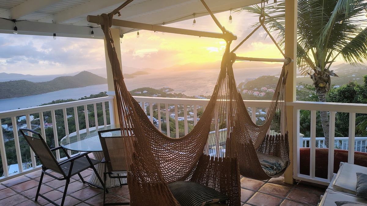 - Þú verður með nýuppgerða einkaíbúð (miðhæð) sem er í frumskóginum hátt uppi í fjallshlíðinni. - Útsýni yfir Charlotte-Amalie-höfn, St Croix og innsýn í St John. - 5 mínútna akstur til Hull Bay og besta fiski tacoið á eyjunni. Magens Bay er í aðeins 10 mínútna fjarlægð. - Starlink Internet svo þú missir aldrei Netið! - Húsasamstæða er knúin af sólarplötum og rafhlöðum til vara!