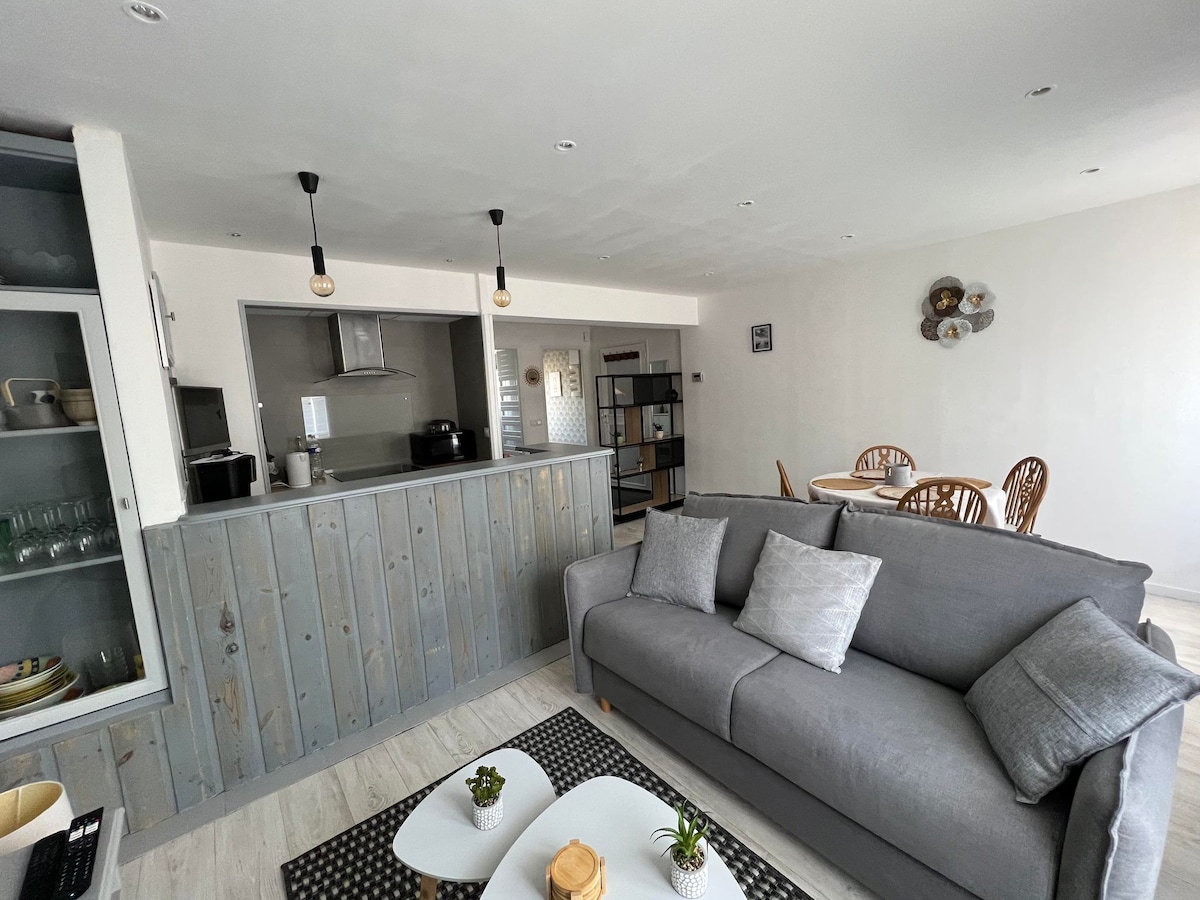 Falleg 3* íbúð á 57 m², reyklaus, staðsett á sjávarbakkanum á 4. hæð án lyftu, nýtur stórkostlegs útsýnis yfir hafið. Nálægt ströndinni, miðborginni, sölubásum fyrir sjómenn þar sem hægt er að kaupa ferskan fisk af bátunum. Markaður á föstudegi og sunnudegi í árstíð. Það er með eldhús (framköllun, ofn, örbylgjuofn,Senseo, uppþvottavél) stofuna (þráðlaust net/trefjar, sjónvarp). 3 rúm: 1x140 og 2 einbreið rúm lök og baðherbergisrúmföt fylgja.