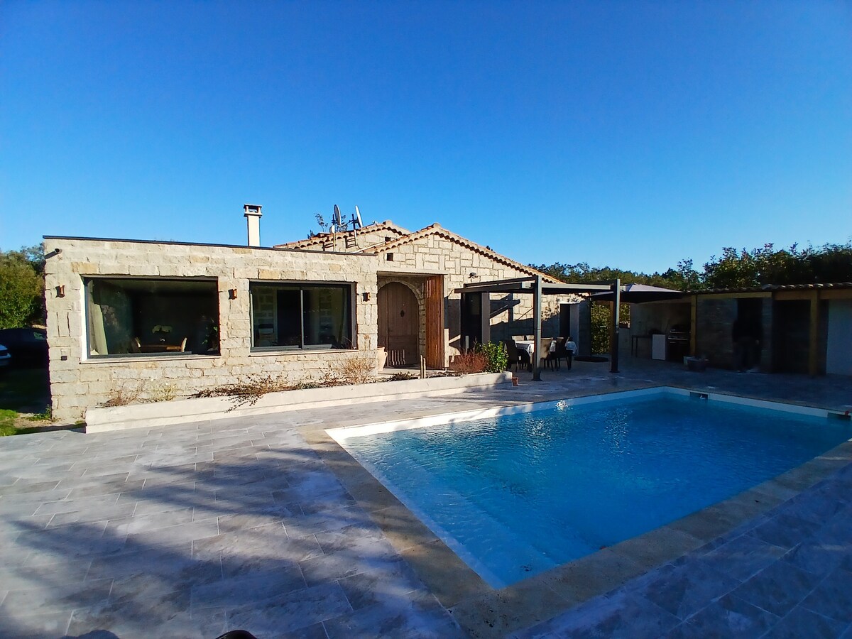 Fallegt, endurnýjað og nútímalegt korsískt hús. Fallegt rými inni og úti með fallegum þægindum og fallegum efnum. Nútíma sameinar sjarma gamla heimsins. Hér eru stórar stofur, þar á meðal: tvær hjónasvítur með baðherbergi, nútímalegt eldhús með miðeyju og búri ásamt borðstofu. Gestir geta notið þess að vera með útihúsgögnum: sundlaug með sturtu og salerni, lítinn fordrykk og 6 stóla undir pergola með gasgrilli.