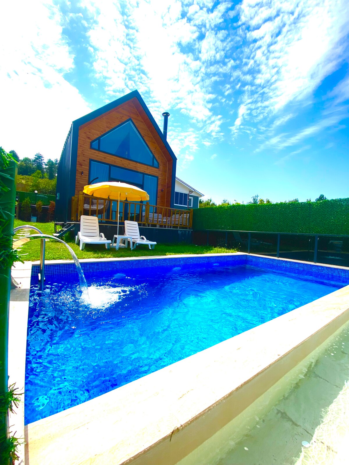 Staðsetning mín er mjög nálægt tlake, útsýni yfir fjöll og skóga, miðborg, skíðamiðstöð, kláfur, fossar, dalir, sjúkrahús, markaðir og hraðbrautir. Hún er alveg laus. Hér er grill, grill, verönd, setusvæði á svölum. 2 mínútna göngufjarlægð frá Sapanca-strönd, 70 m., garður, eldhús og hátt til lofts og hreinlæti Hentar nýjum pörum, viðskiptaferðamönnum, fjölskyldum og stórum hópum. Það er Net, 4 loftræstingar, 2 baðherbergi, 3 wc. og er með fullkomlega sjálfstæða einkasundlaug
