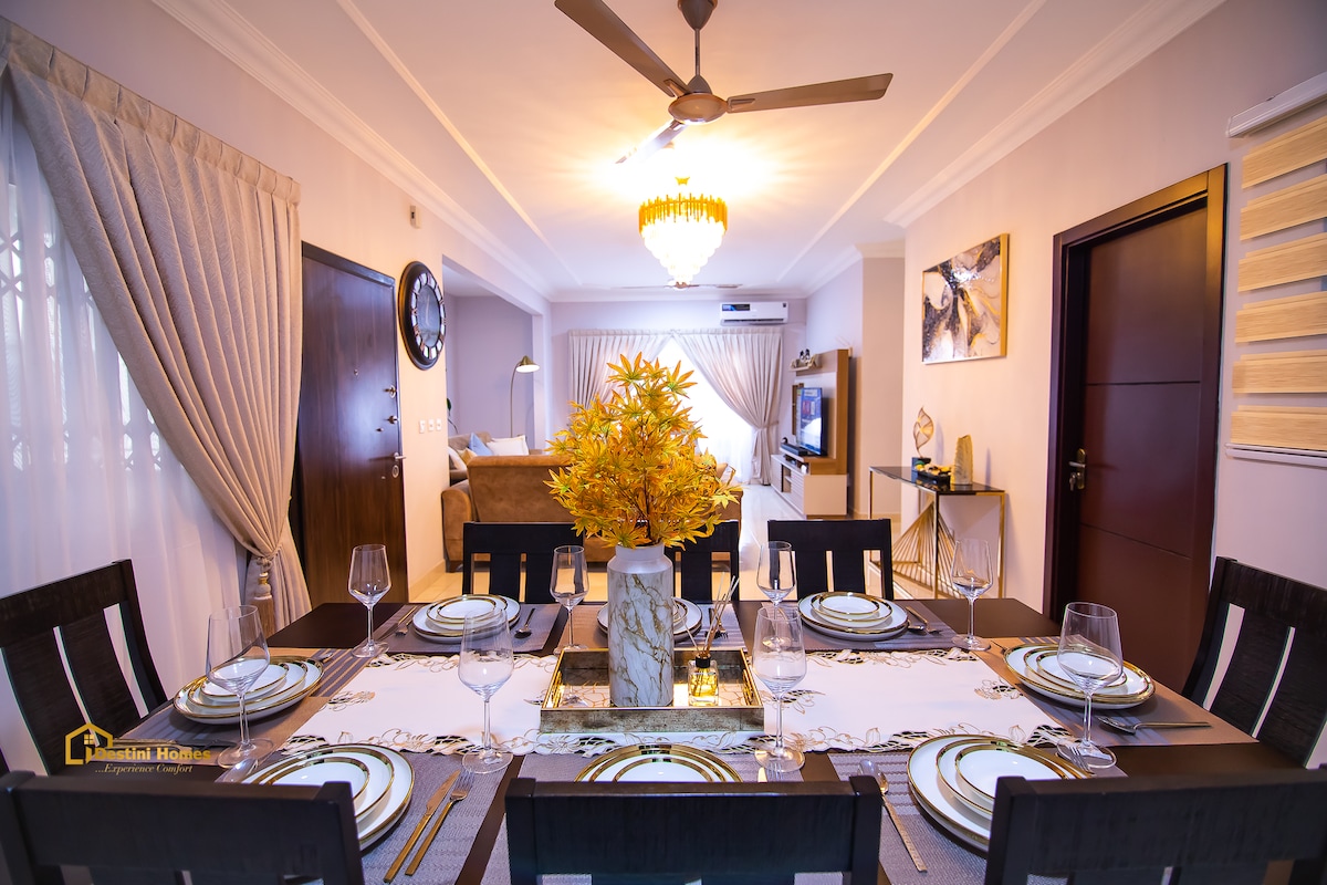 Fjölskyldan þín verður nálægt öllu þegar þú gistir á þessum miðlæga stað. Upplifðu sjarma og þægindi Accra frá þessari nýbyggðu, nútímalegu tveggja herbergja íbúð sem er staðsett í hjarta borgarinnar. Eignin er fullkomin staðsett nálægt helstu áhugaverðum stöðum og viðskiptahverfum og býður upp á greiðan aðgang að öllu því sem Accra hefur upp á að bjóða. Aðeins 20 mínútur frá Kotoka-alþjóðaflugvellinum og 5 mínútur frá hinni táknrænu Labadi-strönd.