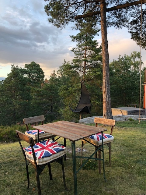 Velkomin á himneska staðinn okkar, fallegt útsýni, stað í sveitinni, rétt fyrir utan miðborg Stokkhólms. Nálægt Eyjafirði og í göngufæri frá vötnum til að synda eða veiða. Vertu tilbúinn að sjá villta rógardýr mjög nálægt húsinu. Útsýnið og ljósið í kofanum að morgni er fallegt og friðsælt. En samt er auðvelt að skiptast á ef þú vilt fá borgarpúlsinn í Stokkhólmi.