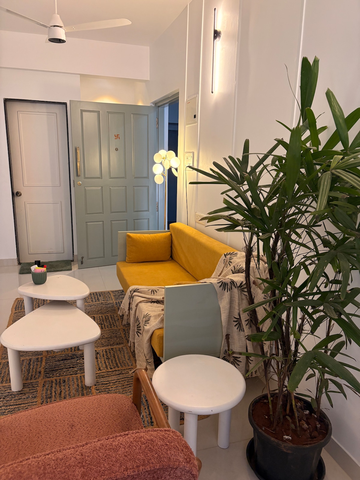 Stúdíóíbúðin okkar er staðsett í kyrrlátri paradís Candolim og býður upp á fullkomna blöndu af þægindum og þægindum fyrir fjölskyldu. Þetta heillandi strandafdrep er steinsnar frá ósnortinni ströndinni og tryggir að róandi öldurnar eru aldrei langt frá eyrunum. Þegar þú stígur inn í þetta notalega stúdíó tekur á móti þér smekklega innréttuð vistarvera sem er böðuð náttúrulegri birtu og skapar hlýlegt og notalegt andrúmsloft.