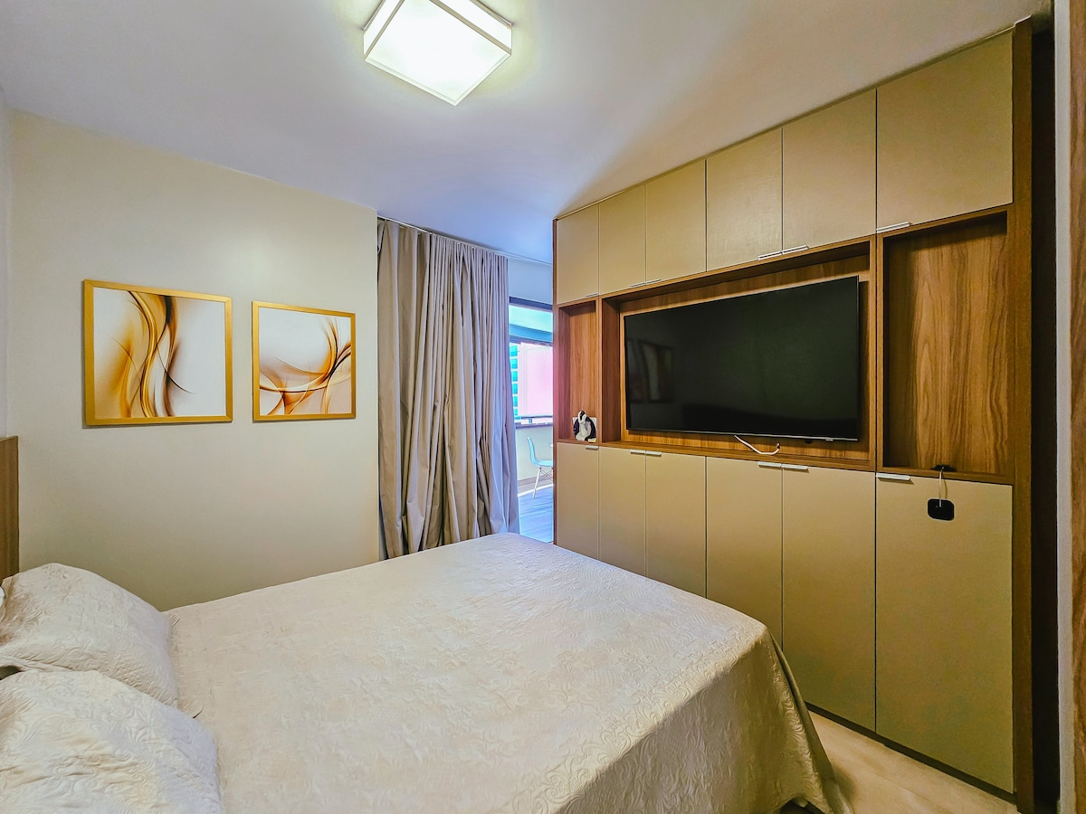 Halló, gistiaðstaðan er stúdíóíbúð með hjónarúmi + einu rúmi, 42" snjallsjónvarpi, eldhúsi með minibar, spaneldavél, örbylgjuofni, kaffivél og ýmsum hlutum til að tryggja þægilega dvöl. Næstum allur búnaður og húsgögn eru ný. Staðsett á aðalviðskiptasvæði borgarinnar. Það er nokkrum metrum frá Shopping Salvador. INNRITUN: frá kl. 14. (Ef þú skyldir þurfa að innrita þig fyrir kl. 14:00 sjá framboð) ÚTRITUN: HÁDEGI * 1 bílastæði
