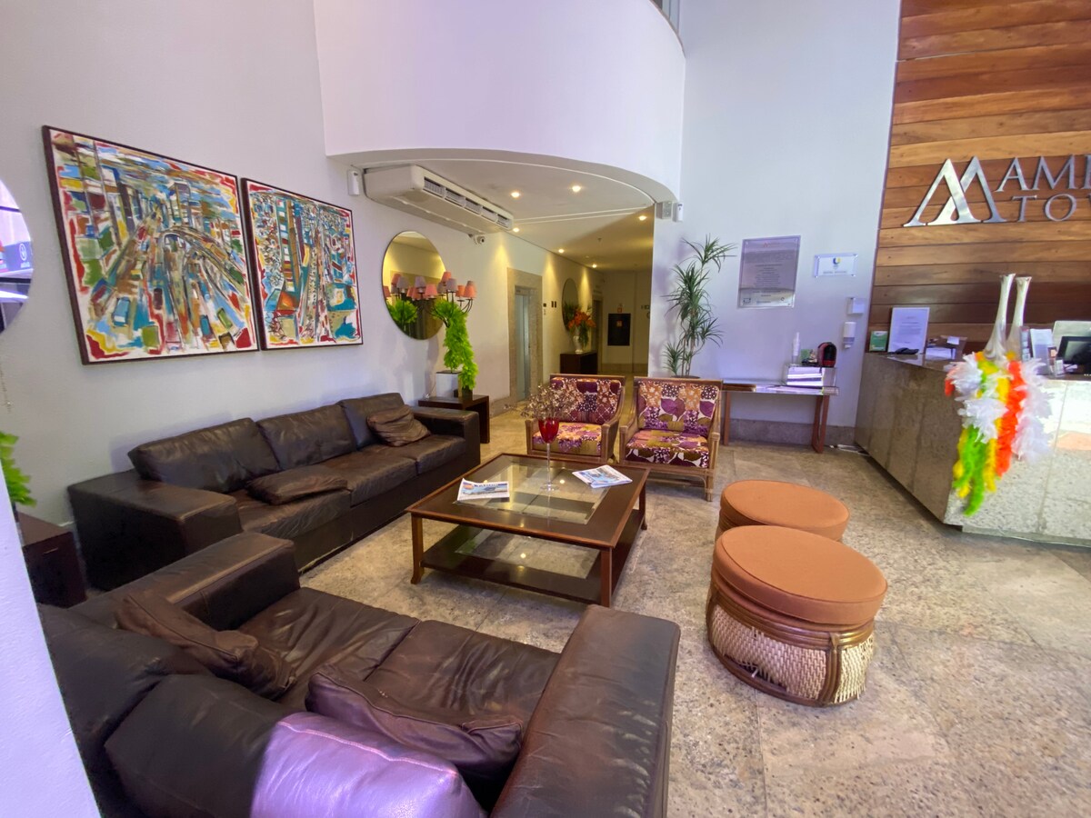 Halló, gistiaðstaðan er stúdíóíbúð með hjónarúmi + einu rúmi, 42" snjallsjónvarpi, eldhúsi með minibar, spaneldavél, örbylgjuofni, kaffivél og ýmsum hlutum til að tryggja þægilega dvöl. Næstum allur búnaður og húsgögn eru ný. Staðsett á aðalviðskiptasvæði borgarinnar. Það er nokkrum metrum frá Shopping Salvador. INNRITUN: frá kl. 14. (Ef þú skyldir þurfa að innrita þig fyrir kl. 14:00 sjá framboð) ÚTRITUN: HÁDEGI * 1 bílastæði