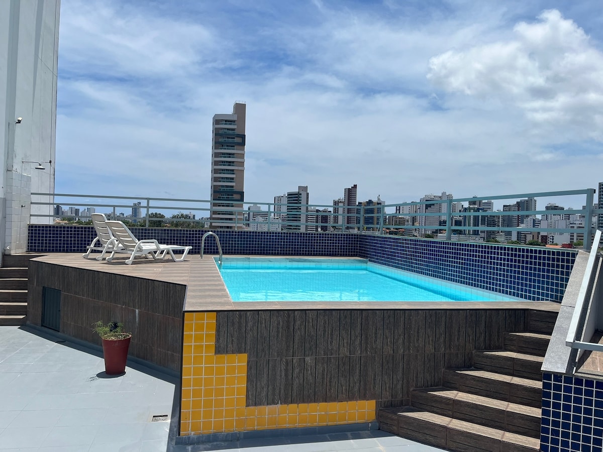 Íbúð með útsýni, sundlaug, nálægt Salvador Shopping