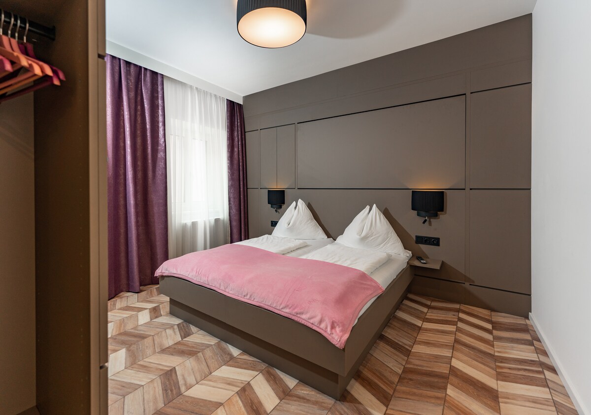 Herbergið okkar er glæsilegt og opið og býður upp á 22 fermetra þægindi ásamt hjónarúmi, sjónvarpi, kaffivél, litlu skrifborði og fallegu baðherbergi með dökkum flísum (með sturtu!). Herbergið er fullkomið fyrir tvo gesti með heillandi pastelluspjaldi og hlýlegri lýsingu og býður upp á allt sem þú þarft til að slaka á og slaka á í tónlistarborg Austurríkis. Og vegna þess að okkur er jafn annt um hnöttinn og gesti okkar er öll upphitun okkar sjálfbær!