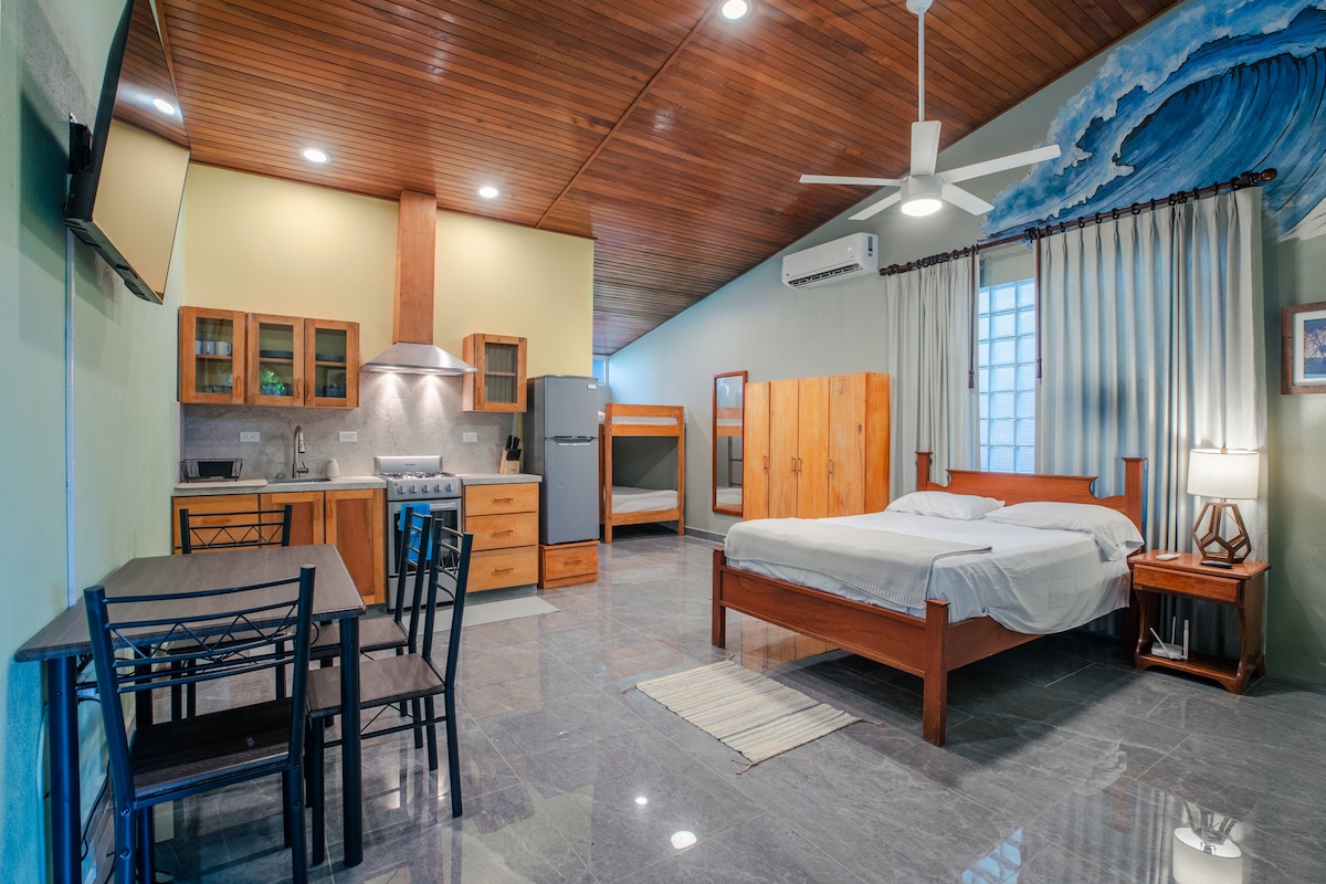 Rúmgóð stúdíóíbúð með opnu skipulagi í 2 mínútna göngufæri frá Guiones-strönd. Með þráðlausu neti, sjónvarpi, loftkælingu, fullbúnu eldhúskróki með ofni og yfirbyggðri verönd umkringdri suðrænum görðum. Hún er staðsett á lóðinni þar sem brimbrettamiðstöðin okkar er staðsett og þar er einnig sundlaug, opið rými, kaffihús og brimbrettaverslun (með leigu og kennslu). Stutt er í fleiri veitingastaði og verslanir. Tilvalið fyrir einstaklinga, brimbrettakappa, pör, fjölskyldur eða litla hópa sem vilja njóta fallega brimbrettabæjarins Nosara.