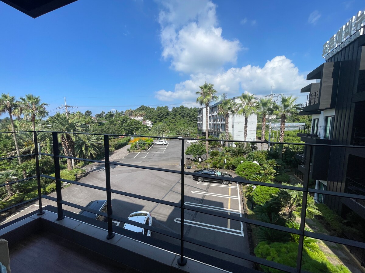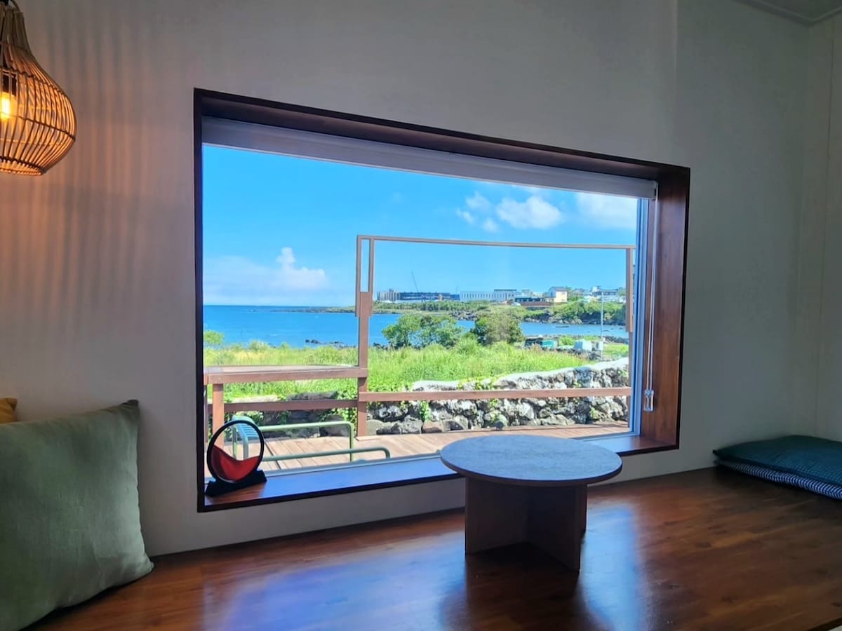 Halló. Við viljum skapa rými þar sem þú getur gleymt pirringi borgarinnar með því að snerta hafið með öldunum sem vinur þinn. Rýmið okkar, sem er í 20 mínútna fjarlægð frá flugvellinum, getur séð Jeju-hafið fyrir framan þig. Space Samsetning 12 pyeong pláss á 3. hæð (með lyftu) 1. Svefnherbergisrými: Herbergið er eins herbergis rými með eldunaraðstöðu. Rúm, vegg-ríðandi sjónvarp, te borð og borðstofuborð fyrir tvo, hanger, standa, vaskur, loft hárnæring, lítill ísskápur (aðskilin frystir), örvun 2. Eldhús: Borðbúnaður og eldhúsáhöld fyrir 2 manns 3. Baðherbergi: Sturta með sólblómum, handklæði, hárþvottalögur, hárnæring, líkamssápa, salernispappír (Athugaðu að ekki er hægt að bjóða tannbursta vegna laga um hollustuhætti). 4. Verönd 5. Grillsvæði Hafgrill tengt sjónum: 20.000 unnar krónur (kol og grill í boði).) Sérstakt grillsvæði er við hliðina á anddyrinu, miðað við rigningarveður. 6. Bílastæði: Rafmagns bílastæði er í boði. 7. Vinsamlegast óskaðu eftir þvottahúsi og þurrkara sérstaklega við innganginn á fyrstu hæð. Þakka þér fyrir.