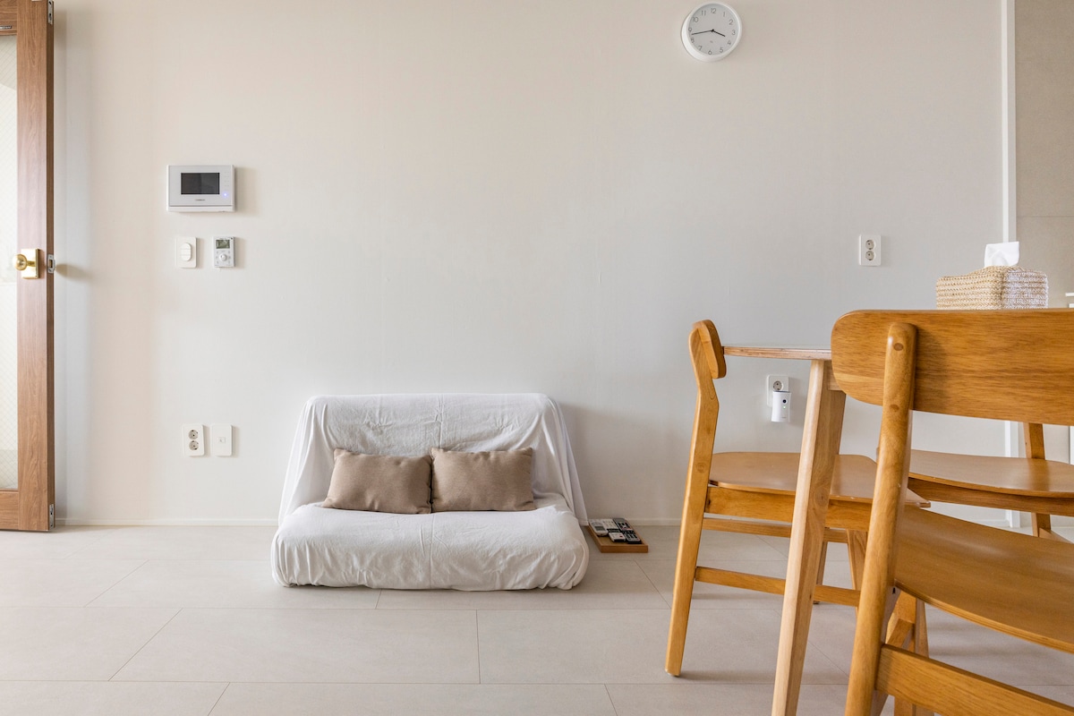 Pura vida: „hreint líf“, „gleðilegt og hamingjuríkt líf“ Tilfinningaleg gisting í 10 mínútna fjarlægð frá flugvellinum þar sem þú getur notið stórkostlegs sjávarútsýnis yfir Jeju. Það er „matvöruverslun“ og „Daiso“ í innan við mínútu göngufjarlægð svo ég held að það verði mjög þægilegt. Þú getur geymt farangurinn hvenær sem er og því biðjum við þig um að ferðast á þægilegan hátt ~ Bættu skemmtun við ferðina þína með Netflix YouTube Television Watcha og fleiru með snjallsjónvarpi * * Einföld eldamennska er möguleg ~ Sýndu matreiðsluhæfileikum þínum fyrir elskhuga þínum og fjölskyldu Þvotta- og þurrkþjónusta er í boði án endurgjalds í Puravida.