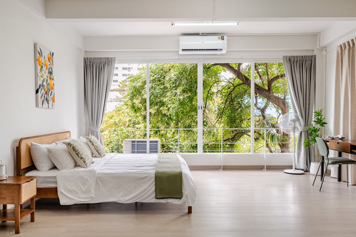 Einkaherbergi með baðherbergi og stórum svölum í rólegu, enduruppgerðu raðhúsi í The Sabai Residence 38. ➕ Sérbaðherbergi (sérbaðherbergi) ➕ Sérherbergi með stórum svölum og læsingum ➕ King-size rúm (stórt og þægilegt) ➕ Hratt þráðlaust net og snjallsjónvarp ➕ Fullbúið sameiginlegt eldhús ➕ 3 sameiginlegar stofur og stórt borðstofusvæði ➕ Lyfta- og farangursvæn aðstaða ➕ Þrif á sameiginlegu svæði 📍 12 mín. göngufæri frá BTS Thong Lo • 5 mín. akstur frá EmQuartier Verslanir, kaffihús og veitingastaðir í nágrenninu ❤️ Vista á óskalista