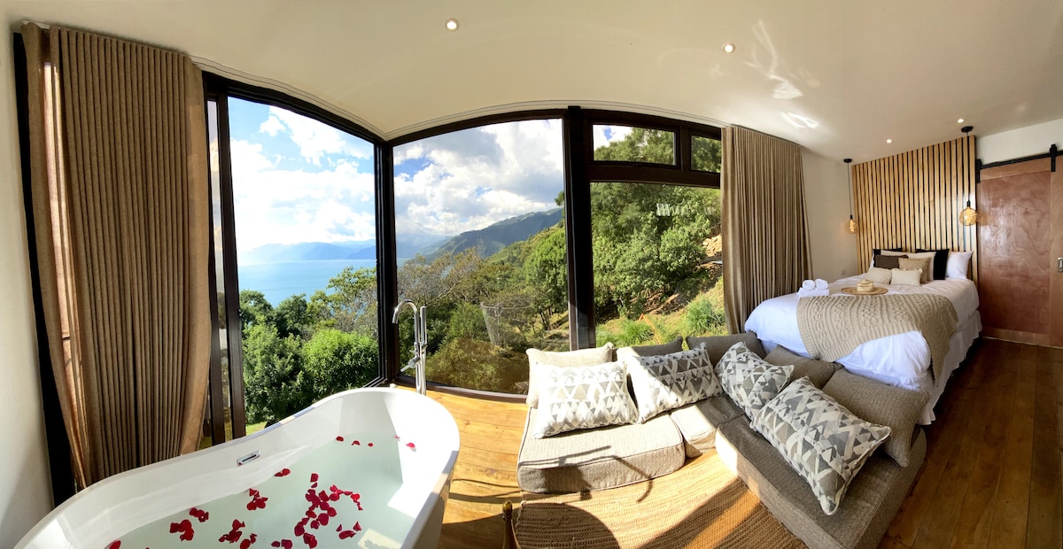 Grand Chalet er afdrep við vatn með stórfenglegu útsýni yfir Atitlán-vatn og sameiginlegum aðgangi að sundlaug, gufubaði, nuddpotti og einkabryggju. Hún var byggð úr eldfjallabergi á áttunda áratugnum og býður upp á sjarma og nútímaleg þægindi. Hún er með hjónaherbergi með king-size rúmi, tveimur svefnherbergjum með sérbaðherbergi ásamt fullbúnu eldhúsi, borðstofu, stofu og útisvæðum sem eru hönnuð fyrir afslöngun.