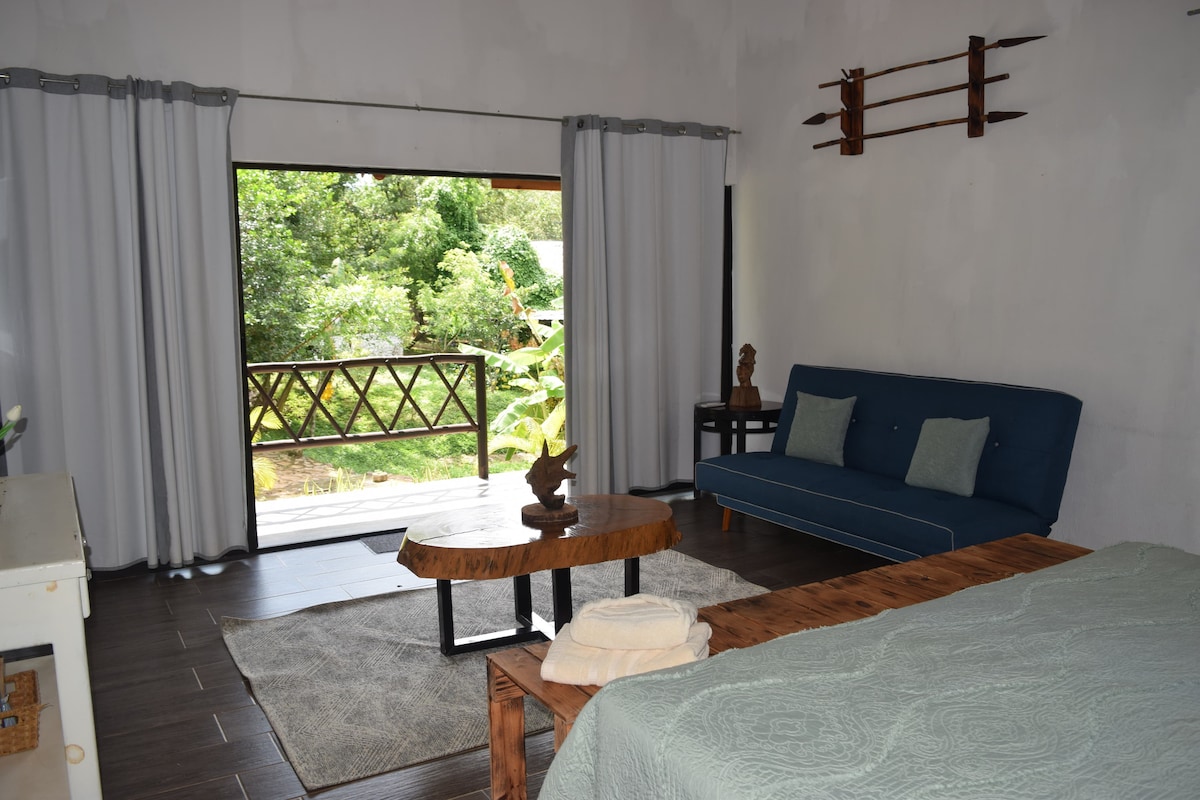 Þægilegt lítið einbýlishús í kofastíl sem er tilvalið fyrir gesti sem vilja tengjast náttúrunni og aftengjast daglegu lífi. Það býður upp á aðgang að læk sem tengist fallegri strönd. Þetta rými gerir þér kleift að búa við alla náttúruþætti. Það er mikilvægt að hafa í huga að Cabaña er ekki staðsett beint fyrir framan ströndina, það er um það bil 80 metra gangur.