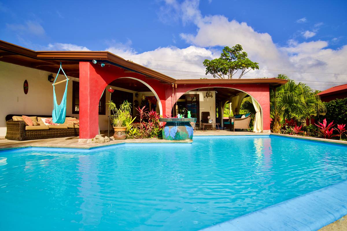 The Pura Vida Suite is a relaxing romantic space with a California king sized bed, air conditioning and an oversized natural stone shower. Enjoy your coffee outside of your double French doors while experiencing nature at its finest. We are known to have approximately 50 varieties of birds on the property. Your room is directly in front of the swimming pool on the main floor and the many varieties of hummingbirds enjoy fluttering around the pool
