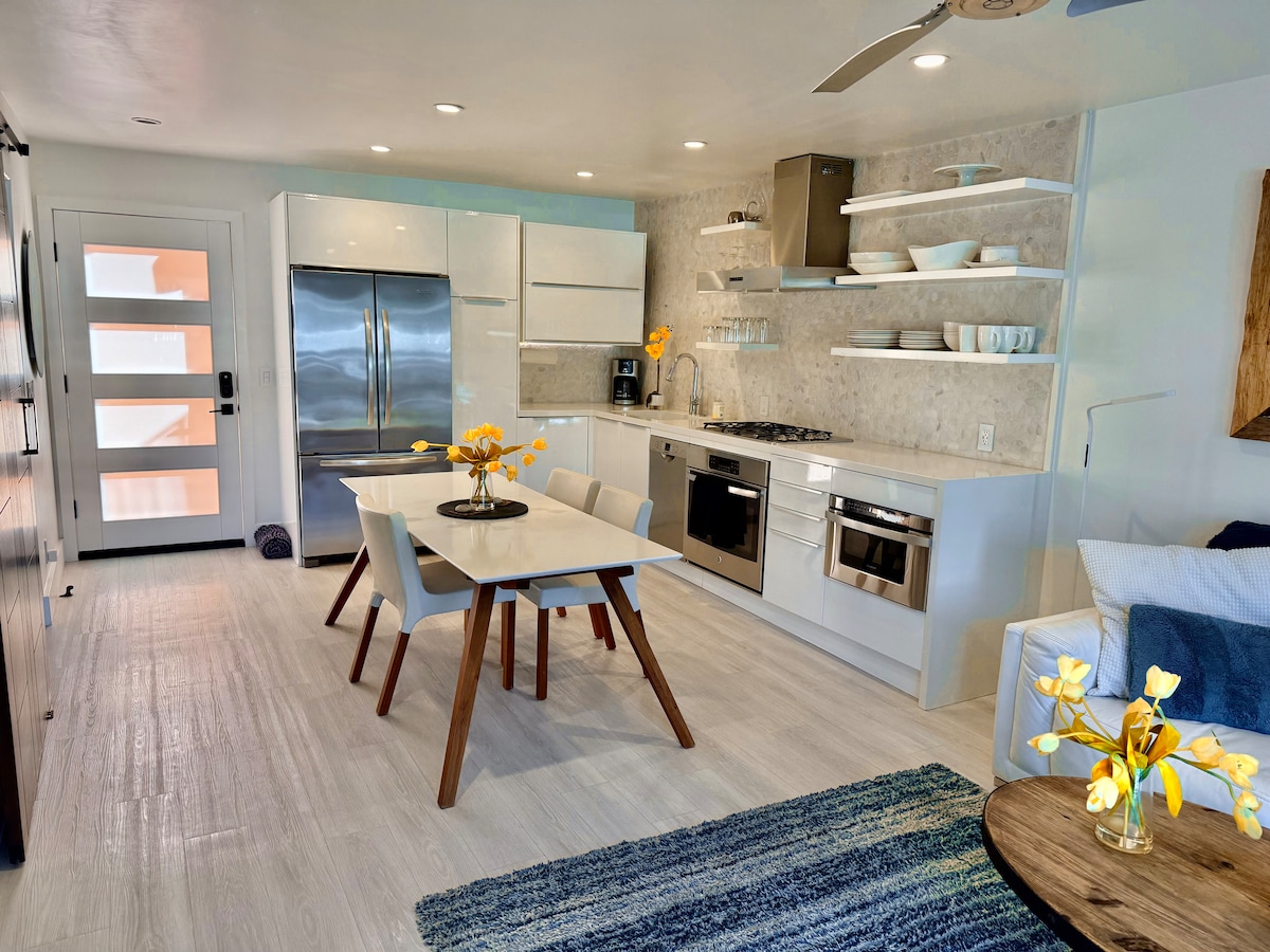 Completely Remodeled Studio THIS CONDO HAS NO ASSIGNED PARKING SPOT • Free bikes, boogie boards, beach gear, etc. • Quick walk to beach, pier, dining, trolley & shops • Soundproofed / Quiet • Desk & Office Chair • Redundant 300Mps Wi-Fi • Private balcony w/ BBQ • Cook’s kitchen • Keurig coffee w/ pods • Lux mattresses & bedding • Pet-friendly • Private entrance + keypad self check-in • Outdoor Shower • Mini split air conditioning • Washer+dryer