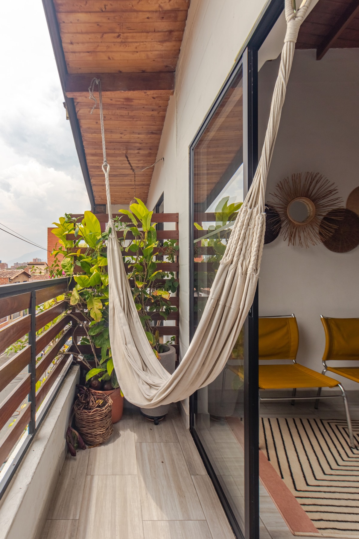 3450 Living is easy to spot among the trees in Laureles. Designed like the bow of a ship, the angular combination of glass, brick, black metal, and concrete is conveniently located. The relaxed atmosphere is perfect for young professionals, students, couples, digital nomads, or friends looking for a cost-effective space in a prime location. Four floors of modern-chic apartments feature expansive valley views from the balconies, residents also have access to the rooftop social area with jacuzzi.