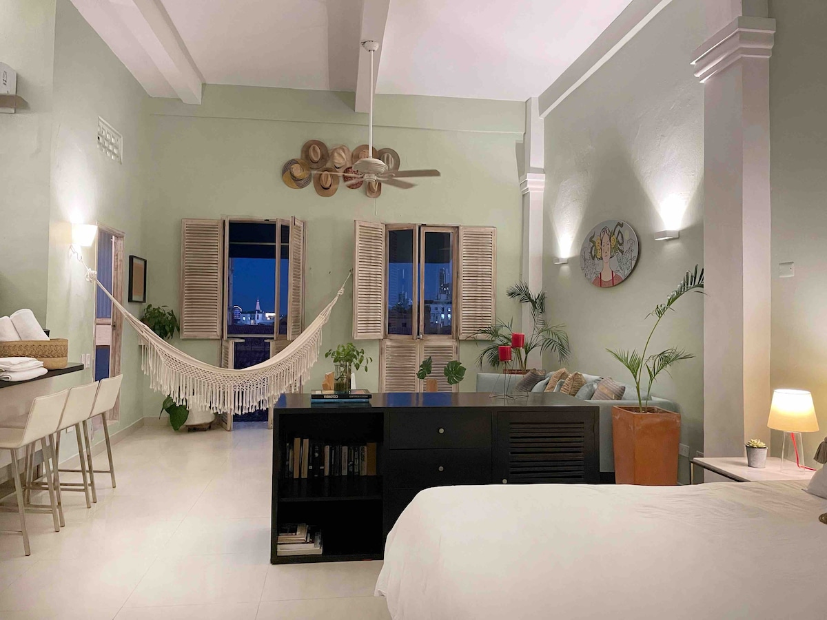 1 BR Loft svíta í hjarta Cartagena sem er innblásin af nokkrum af bestu 5 stjörnu hótelum heims. Staðsettar innan veggja gömlu borgarinnar, í göngufæri frá verslunum, afþreyingu, veitingastöðum, næturklúbbum og börum. Njóttu þess að gista í þessum Unesco Heritage bæ sem er fullur af sögu og spennu. Fullbúið eldhús með þvottavél/þurrkara, stóru rúmi í king-stærð, sófa í queen-stærð, sjónvarpi, Netflix og 300 MbWi-Fi. Nútímalega strandíbúðin okkar er fullkomin fyrir pör til að njóta lífsins og slaka á.