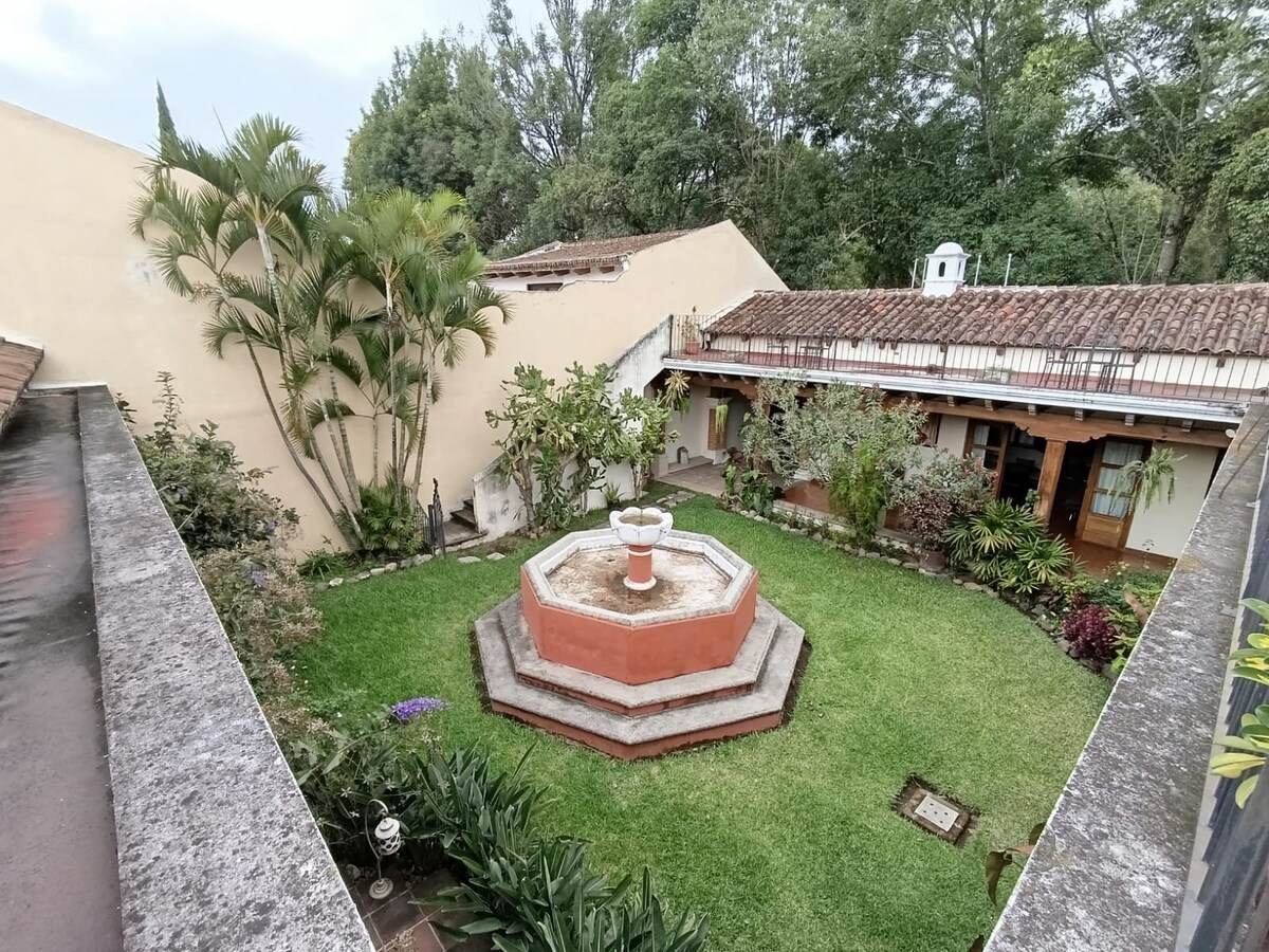 Slakaðu á í þessu einstaka og friðsæla fríi. Njóttu náttúrunnar með mildum möglum trjánum, líflegum lit blómanna, ljúfum fuglasöngnum og róandi hljóði vatnsins úr gosbrunninum okkar. Njóttu útsýnisins yfir stórfenglegu eldfjöllin frá veröndinni fyrir framan íbúðina sem veitir þér fullkomið pláss til að hvílast og slaka á eftir að hafa gengið um nýlenduborgina Antigua Guatemala og kynnst öllu því sem hún hefur upp á að bjóða. Öryggi allan sólarhringinn.