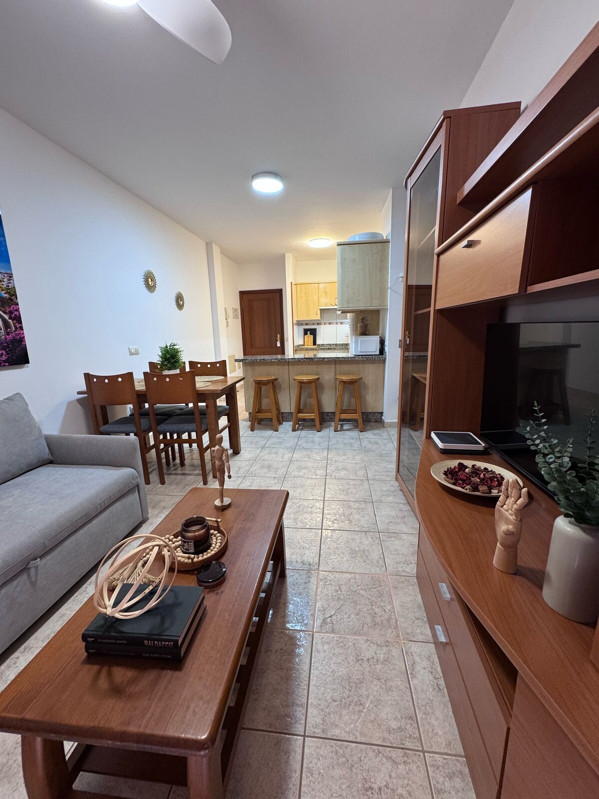 Bright and cozy apartment between Playa Chica and Cabezo beach, 3 min walk from the beaches and 5 min walk from the center of El Medano. Nice balcony with side views to two beaches and front view to the peak of mount Teide. One bedroom with double bed and sofa bed in the living room. Cradle available. New and equipped kitchen. Near the apartement there are restaurants, supermarkets, shops, pharmacy, medical center, dentist... Very quiet building. VV3841999