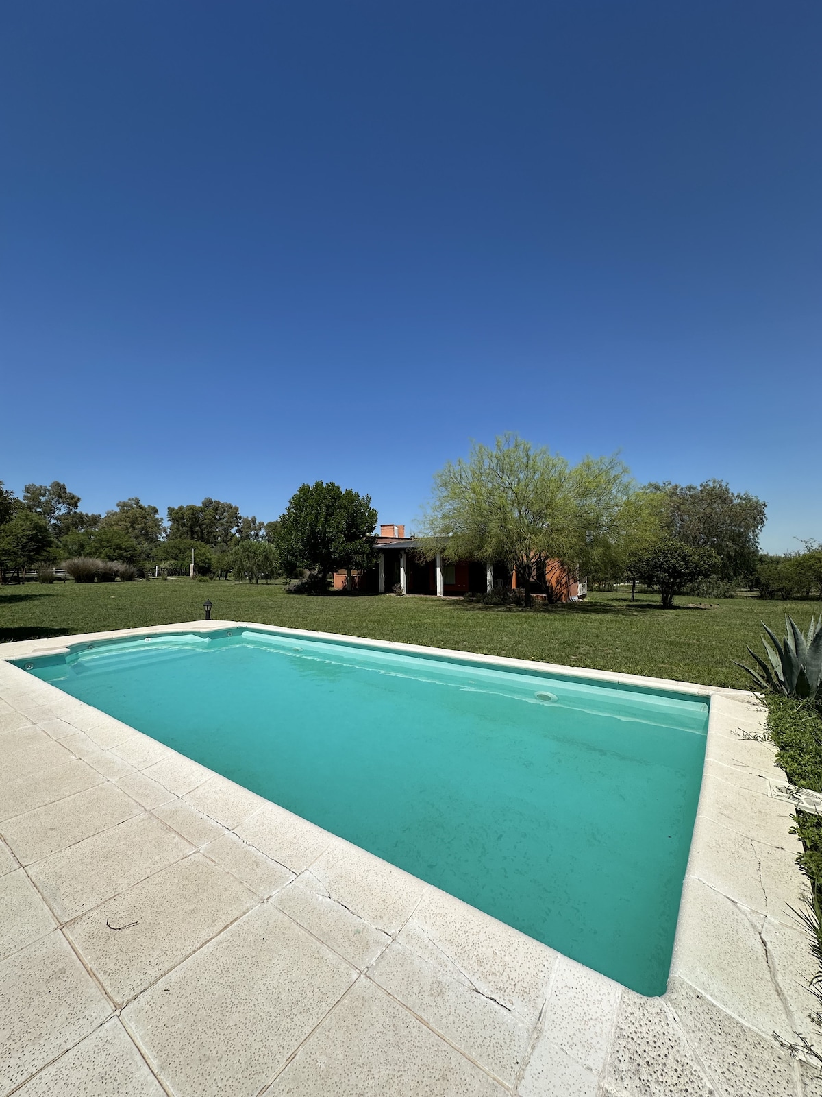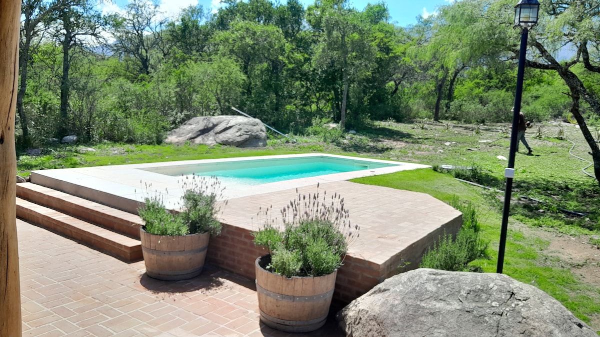 Halló, við erum par sem nutum einstakrar eignar með mögnuðu útsýni yfir Champaquí hæðina og landamærin, eins og allan dalinn almennt. 6.400 mts2 garður og 9x4,5 sundlaug með blautri þakverönd og vatnsrennibraut. Við bjóðum þér aðskilinn kofa frá húsinu okkar með sérbaðherbergi og sérinngangi og bílastæði. Við erum með gæludýr og getum því ekki tekið á móti gestum með gæludýr. Við bjóðum upp á hlýju umhverfisins með aðgangi að lauginni.