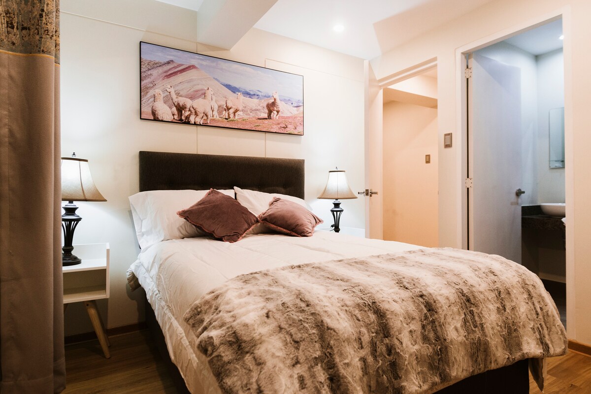 ✨ Fullkomin bækistöð til að skoða Cusco og Machu Picchu ✨ Verið velkomin! Þessi nútímalega íbúð á 9. hæð býður upp á magnað útsýni yfir Andesfjöllin, þægilegt andrúmsloft og stefnumótandi staðsetningu sem er fullkomin fyrir ferðamenn sem vilja sjá það besta sem Cusco hefur upp á að bjóða. Staðsett á rólegu og öruggu svæði Wanchaq, þú verður í aðeins 15 mínútna akstursfjarlægð frá sögulega miðbænum með greiðan aðgang að leigubílum, almenningssamgöngum og skoðunarferðum til Machu Picchu, Sacred Valley, 7 Colors Mountain og fleira.