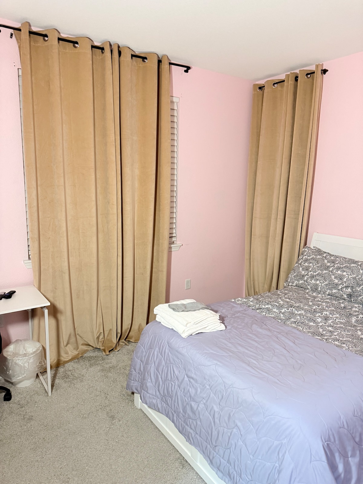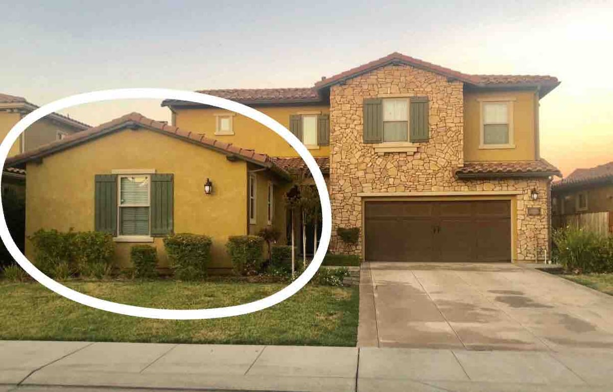 Casita er í öruggu afgirtu samfélagi með öryggiseftirliti í Manteca. Casita er með sérinngang með 2 svefnherbergjum, 1 stofu og fullbúnu baðherbergi. Loftræstieiningunni er stýrt í aðalhúsinu en ekki í casita. Herbergi 1: king-size rúm með tvöföldum hurðum að stofunni. Herbergi 2: rúm í queen-stærð Það er fataherbergi, fullbúið baðherbergi með sturtu. Ísskápur, örbylgjuofn, Keurig-kaffivél, hitaplata -Athugaðu að það er EKKI fullbúið eldhús-