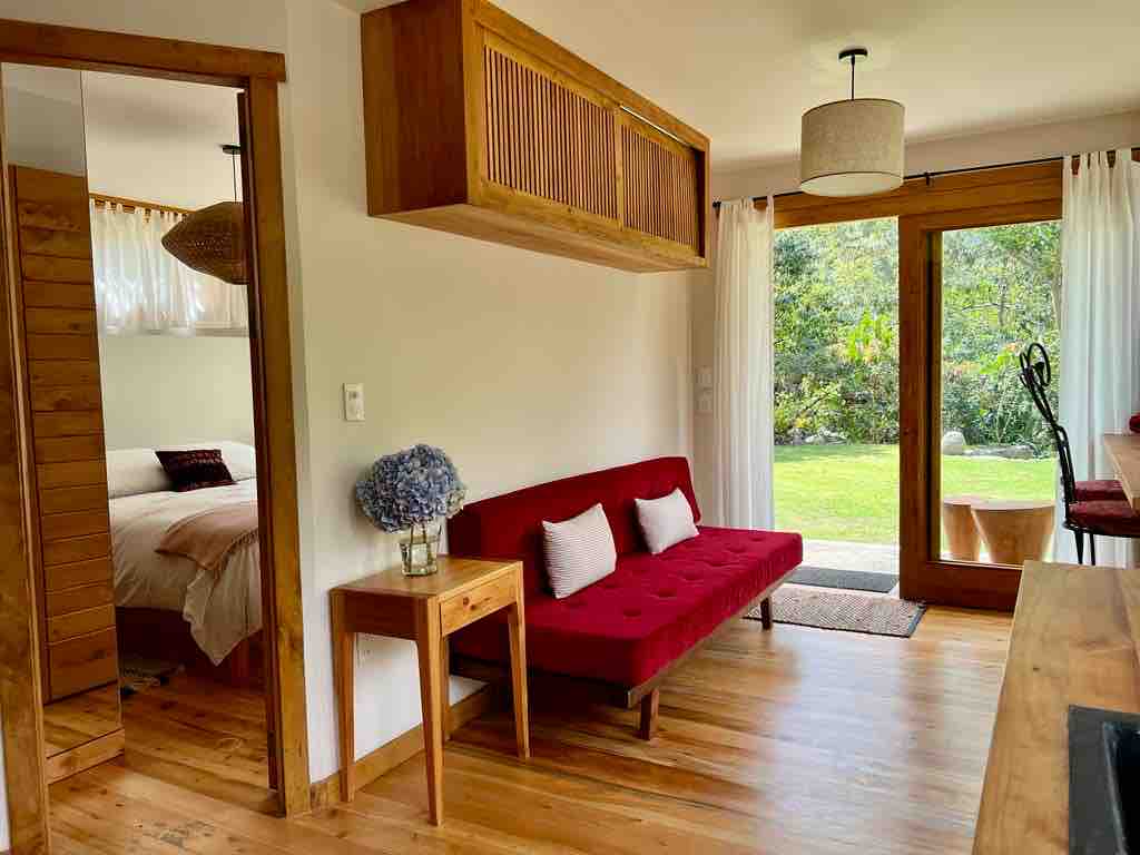 Casa Blue Rock Íbúð á fyrstu hæð gerð af ást með mikilli áherslu á smáatriði , með nútímalegum smekk og hreinum minimalískum stíl fullum af birtu. Rúmgóð stofa með þremur dýnum, sjónvarp með kapalneti 10 mega með WI FI , eldhús með borði á 5 stöðum, sérbaðherbergi með sturtuborði með nuddþotum. Einkasvefnherbergi þar sem hinn frægi blái klettur kemur upp úr gólfinu með king-size rúmi. Loftræsting og tveir risastórir gluggar með útsýni yfir regnskóginn