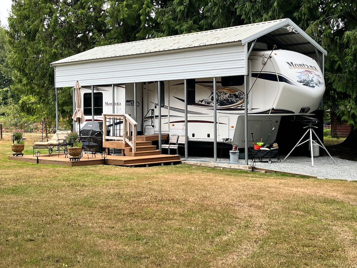 Spacious 40' RV with a high ceiling located in a rural part of Anacortes on a tiny working farm. Cross the street to sit on our ocean view deck. Clean, well stocked, comfortable beds, camp fires allowed, large kitchen. ! ONLY 8 minutes to Anacortes Ferry Dock ! 5 min. to Beautiful Rosario Beach 7 min. to Deception Pass. 3-5 min. to Lakes Erie and Campbell 20 min. to La Conner Tulip Festival +Many other nearby sites of natural beauty Homemade Indian Meals Available - Ask for our menu