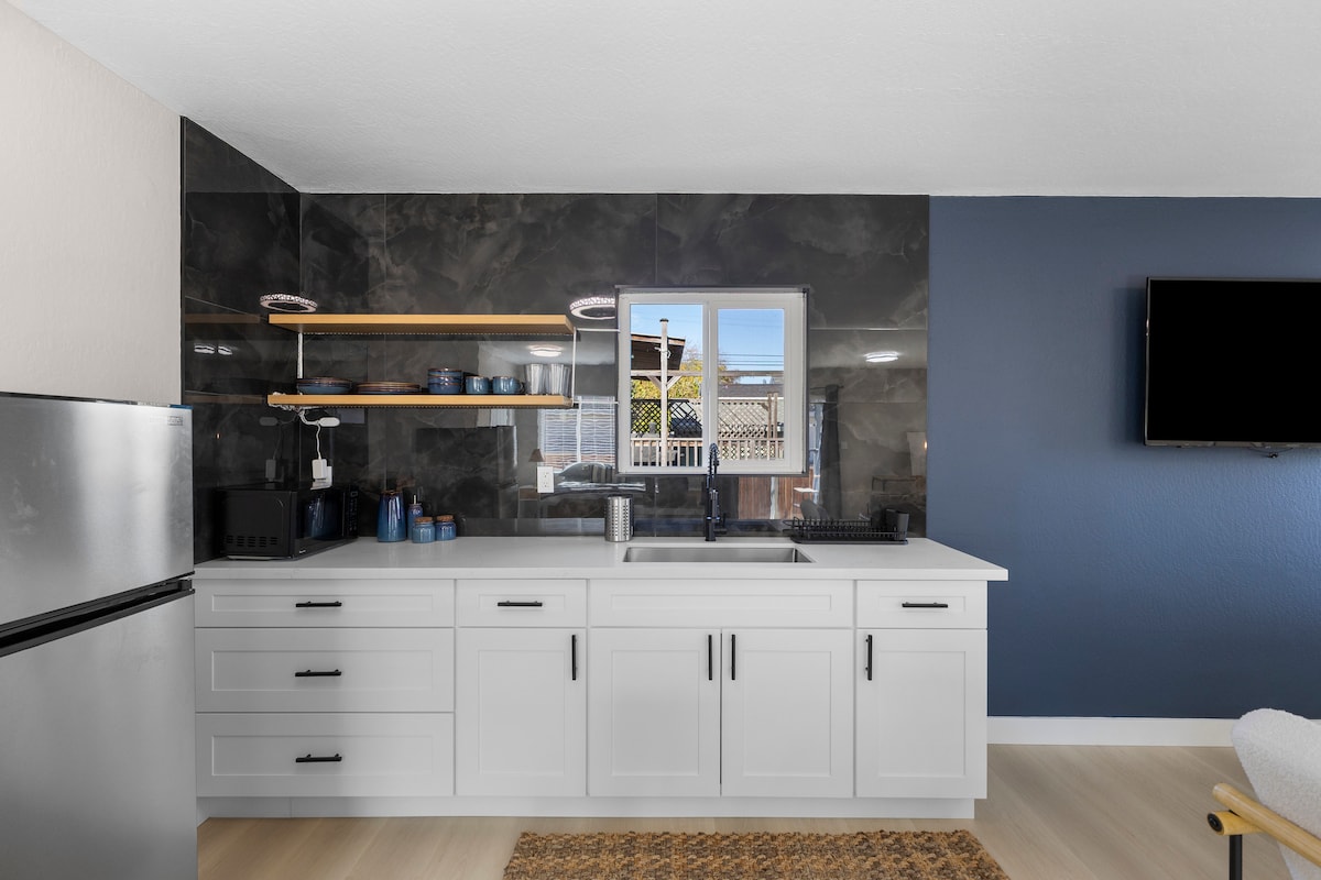 Þetta heimili, eins og hótel, hefur verið endurnýjað af fagfólki og hannað til að hámarka þægindi, þægindi og ánægju dvalarinnar. Eldhúsið er með risastóran VÁÞÁTT með ryðfríum hágæðatækjum sem eru fullbúin og tilvalin til matargerðar, skemmtunar eða baksturs. Inni-/útivera með tvöföldum frönskum hurðum sem opnast út í fallega bakgarðinn með útihúsgögnum, grilli og eldstæði sem henta vel til að njóta okkar ótrúlega veðurs í Kaliforníu. Snjallsjónvarp er í hverju herbergi fyrir Netflix-kvöldin!