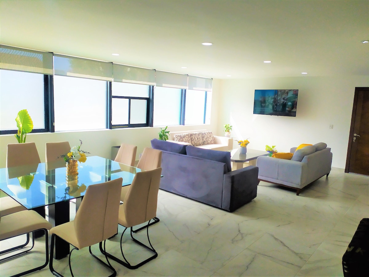 Tilvalið fyrir pör, fjölskyldur eða hópa. Nútímalegt, 200 metra íbúðarhæft, í þriggja mínútna fjarlægð frá Udlap. Hentar fólki í hjólastólum á jarðhæð. Facturamos. Við erum með 3 íbúðir í sömu niðurhólfun. Fyrir stóra hópa eða fjölskyldur Staðsetning 2 mínútur frá vistfræðilegu og Recta útjaðri til Cholula, 7 mínútur frá Cholula Pyramid. Háhraðanet. Búin þvottavél og þurrkara Við erum með handklæði, sjampó, sápu, drykkjarvatn, kaffi og sykur.