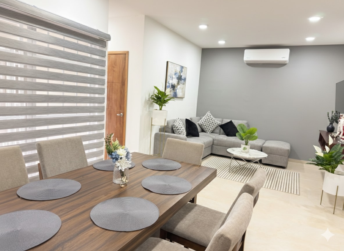 Departamento moderno en Ciudad Valles, ideal para hasta 4 personas. Cuenta con dos baños completos con agua caliente y recámara privada con dos camas, aire acondicionado, ventilador y Smart TV. El área social integra cocina, sala y comedor. Diseño minimalista. Incluye WiFi, estacionamiento privado y cocina equipada con estufa de inducción, refrigerador y microondas. Un espacio cómodo y funcional para disfrutar la Huasteca Potosina o la ciudad, ya sea por descanso o trabajo.