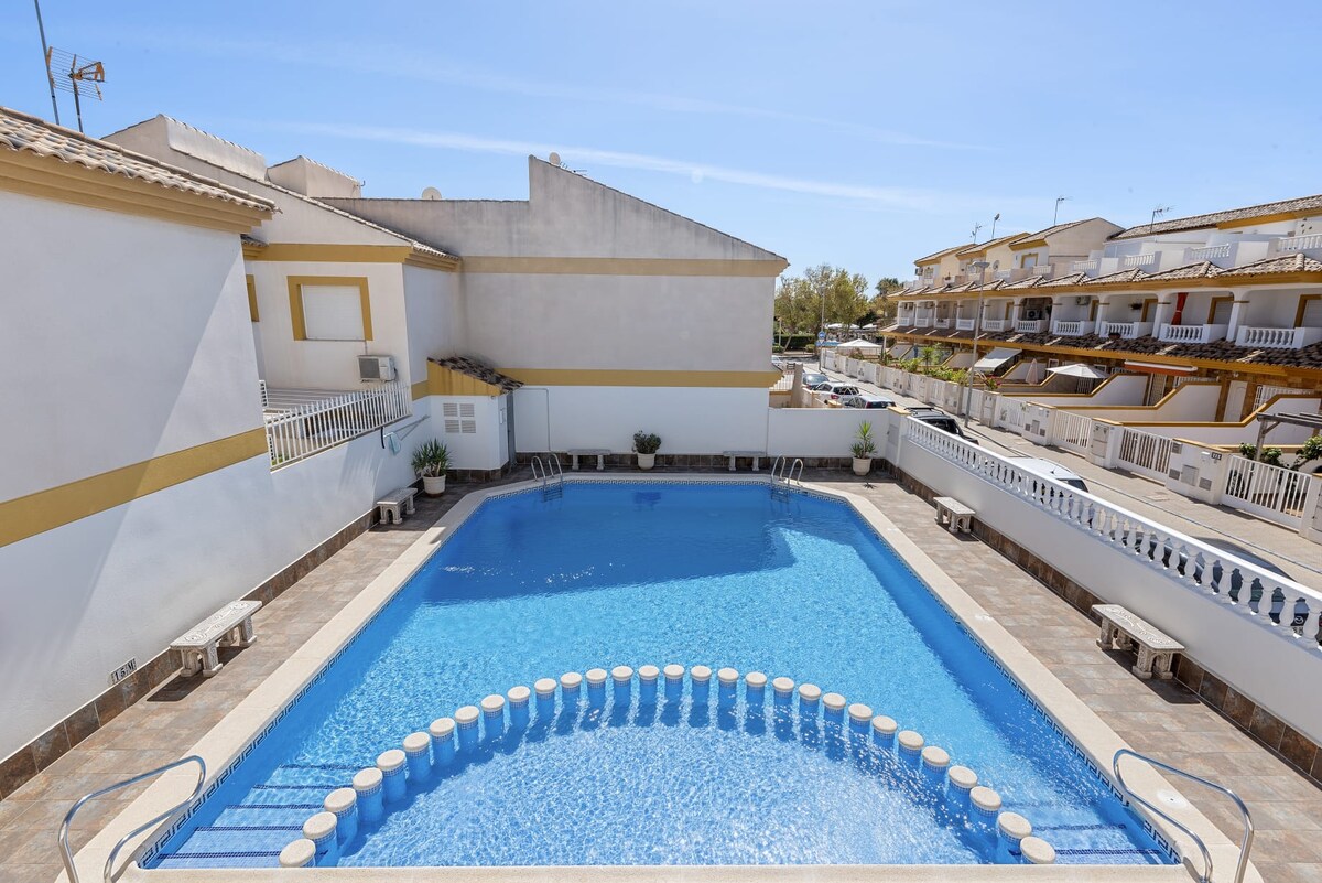 Slakaðu á í þessari rólegu og glæsilegu eign. Tvö svefnherbergi með tvíbreiðum rúmum og svefnsófa fyrir allt að 6 gesti. Öll svefnherbergi og stofa með heitri/kaldri loftræstingu. Allur búnaður er til staðar svo að gistingin þín verði þægileg. Njóttu grillsins , sólarrúma og hressandi sturtu í þakinu. Eða syntu í sameiginlegri sundlaug. Mar Menor strönd og leðjuböð í aðeins 10 mín göngufjarlægð. Alþjóðaflugvöllur Murcia 20 mín og Alicante flugvöllur 50 mín á bíl. Bílaleiga í boði. VV. MU .3171-1