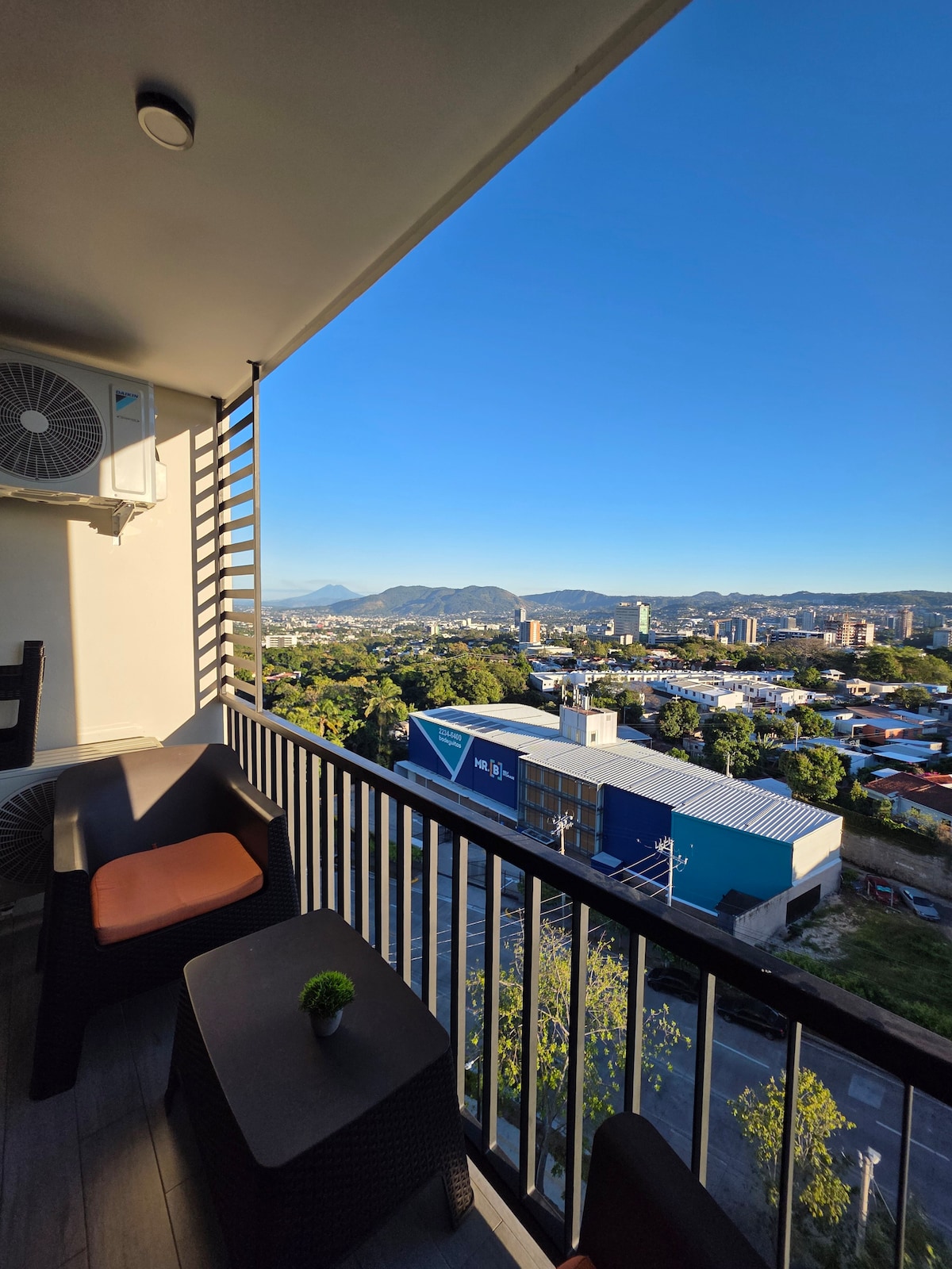 Nútímalegt heimili þitt í Antiguo Cuscatlán ✨ Gistu í glæsilegri íbúð með 1 svefnherbergi á 11. hæð með mögnuðu útsýni yfir San Salvador. Fullkomið fyrir viðskiptaferðir, langtímagistingu eða örugga og þægilega bækistöð um leið og þú skoðar borgina. Inniheldur: ✔️ King-size minnissvamprúm, myrkvunargluggatjöld, skrifborð og stóll fyrir fjarvinnu. ✔️ Nútímaleg stofa með 65" snjallsjónvarpi, Alexu og svefnsófa (1,70m). ✔️ Fullbúið eldhús ✔️ Einkasvalir með yfirgripsmiklu útsýni ✔️ Bílastæði OG háhraða þráðlaust net