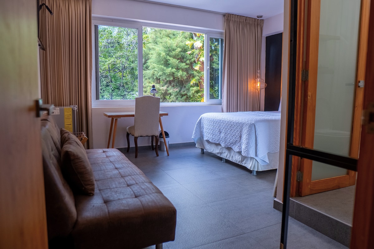 Mjög notalegt herbergi á rólegu hönnunarhóteli í Colonia Escalón. Umkringd náttúrunni, í hjarta borgarinnar, frábær staðsetning. 4 húsaröðum frá galleríum, minnismerki um guðdómlegan frelsara heimsins, með meira en 50 veitingastöðum í kring. Þægilegur aðgangur að sögulegum miðbæ, bensínstöðvum, matvöruverslun og verslunarmiðstöðvum. Fullbúið og með aðgang að eldhúsi, borðstofu og verönd. Auðvelt að komast að vegum sem liggja að flugvelli, ströndum, ferðamannastöðum og almenningssamgöngum.