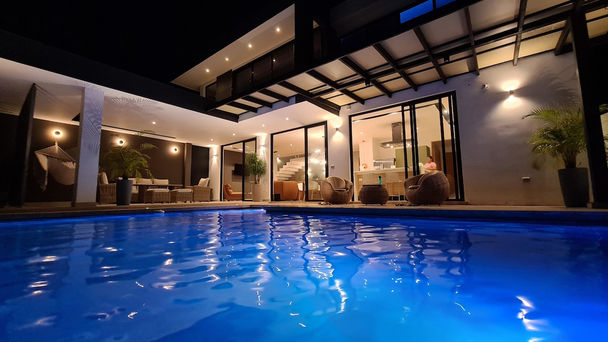 GLÆNÝTT.. Skemmtu þér með allri fjölskyldunni í þessu glæsilega og fágaða gistirými í hjarta brimbrettaborgarinnar í 20 mínútna fjarlægð frá bænum. Stórkostleg sundlaug og sjávarútsýni frá hvaða horni hússins sem er, lúxusfrágangur og ótrúleg þægindi, hvert herbergi með fataherbergi og sér lúxus baðherbergi. Leggðu fyrir 3 ökutæki, bílastæði fyrir gesti, grænt svæði fyrir framan húsið og einkaöryggi í lokuðu íbúðarhúsnæði. Innifalið er starfsmaður allan sólarhringinn.