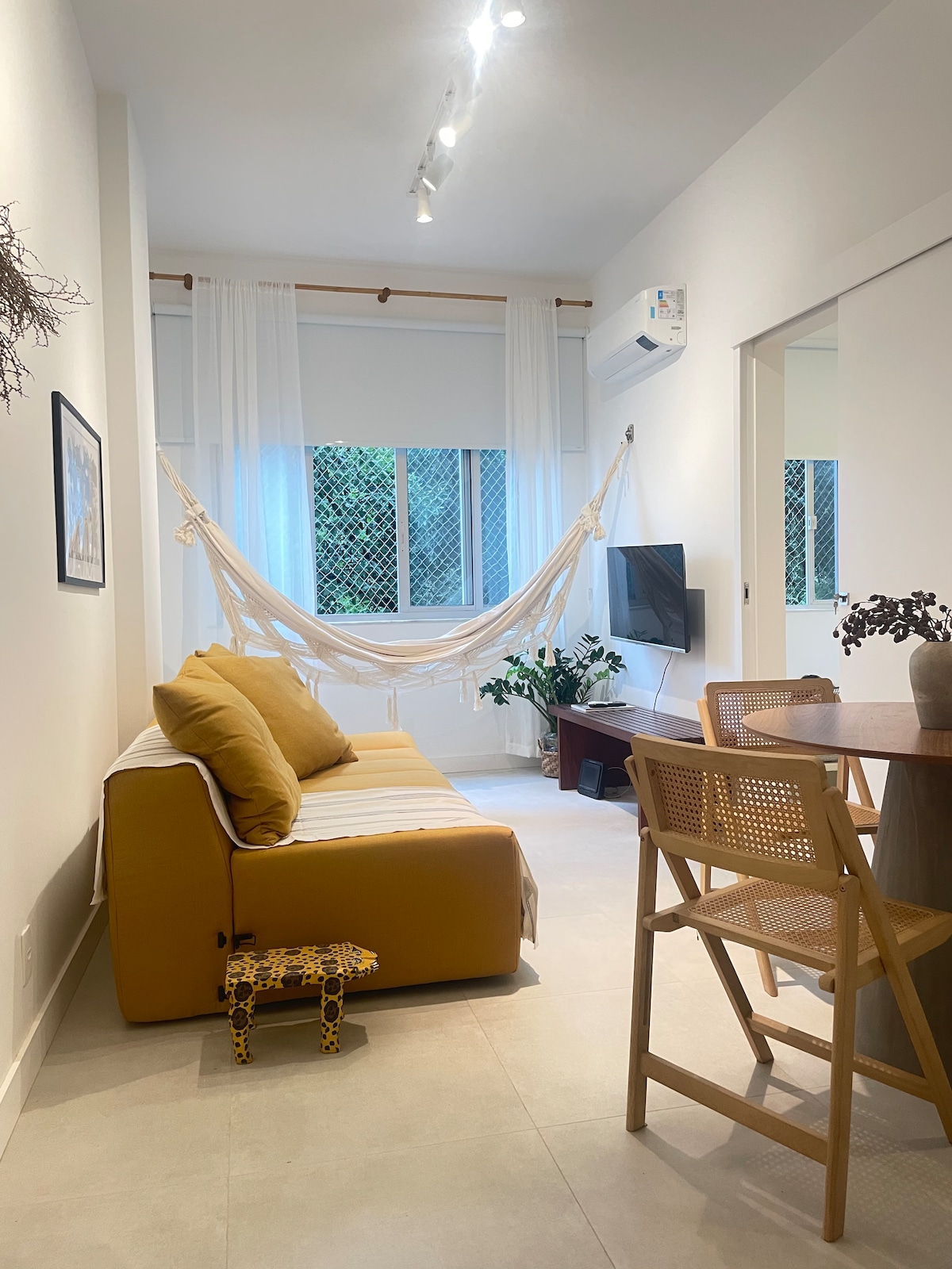 Espaço inteiro. O apartamento é amplo, aconchegante, organizado, bem arejado e iluminado, com sol da manhã. No quarto, há uma cama queen (euro colchão super premium) e um closet espaçoso. A sala é grande, com mesa de jantar, sofá-cama (casal) e uma varanda com plantas e rede. A cozinha é completa, equipada com todos os utensílios necessários. O banheiro foi reformado e possui chuveiro 220v. O ambiente conta com ar-condicionado, ventilador de teto e ventilador portátil de chão.