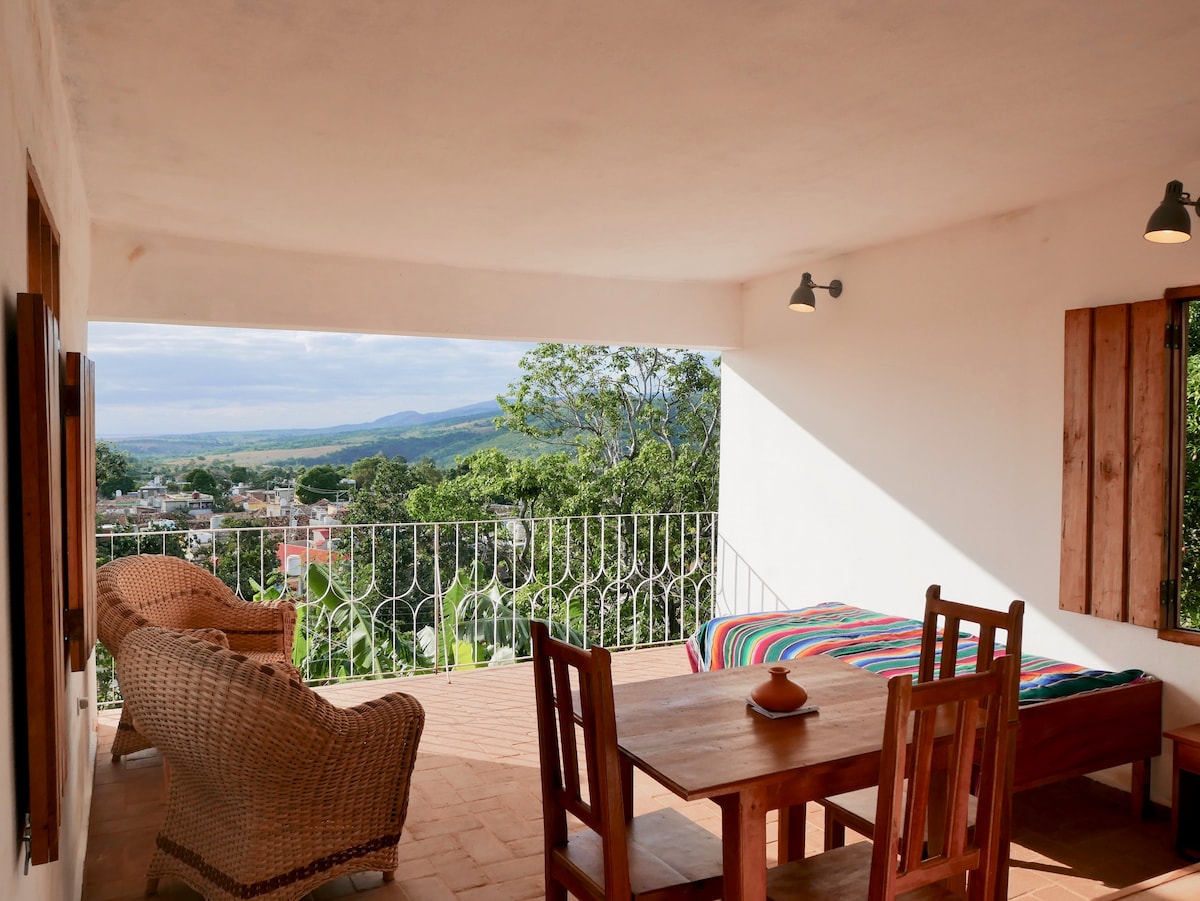 Jardin de Juana is an independent casa de campesino, a cuban style country house, totally renovated and opened for guests in 2018 and now solar powered. It is situated up on a hill in a tranquil neighborhood overlooking the old Trinidad, just 300 meters from the Plaza Mayor, the center of the old town. Playa Ancon, the best beach on the south coast of Cuba is just 15 mins. drive away. From the garden, shaded by the mango and avocado trees, there are great views to the sea and to the mountains.
