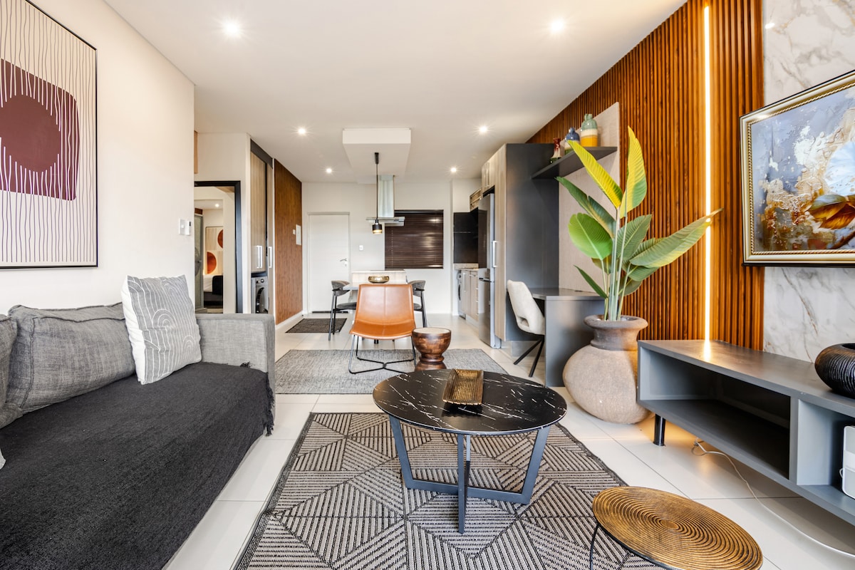 Upplifðu lúxusinn í hönnunaríbúðinni okkar í hjarta Sandton. Þetta glæsilega, nútímalega rými býður upp á úrvalsþægindi og magnað borgarútsýni sem er fullkomið fyrir kröfuharða ferðamenn. Þú hefur greiðan aðgang að heimsklassa verslunum, veitingastöðum og skemmtunum í nokkurra mínútna fjarlægð frá Sandton-borg og Nelson Mandela-torgi. Þetta glæsilega athvarf lofar fágun, þægindum og þægindum í fremsta hverfi Jóhannesarborgar, hvort sem það er vegna viðskipta eða tómstunda.