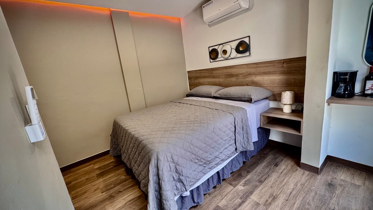 Njóttu þægindanna og stílsins í þessari íbúð í Residencial Los Alpes, fyrir framan grænt svæði. Hér er notalegt herbergi, fullbúið eldhús með nútímalegum tækjum og stofa með svefnsófa sem hentar gestum. Búin 2 loftræstingum og þráðlausu neti. Slakaðu á á litlu veröndinni sem er fullkomin fyrir grillveislu. Baðherbergi sem virkar fullkomnar rýmið. Rólegt og öruggt umhverfi með greiðan aðgang að öllum nauðsynlegum þægindum. Tilvalið fyrir eitt par eða einn einstakling.