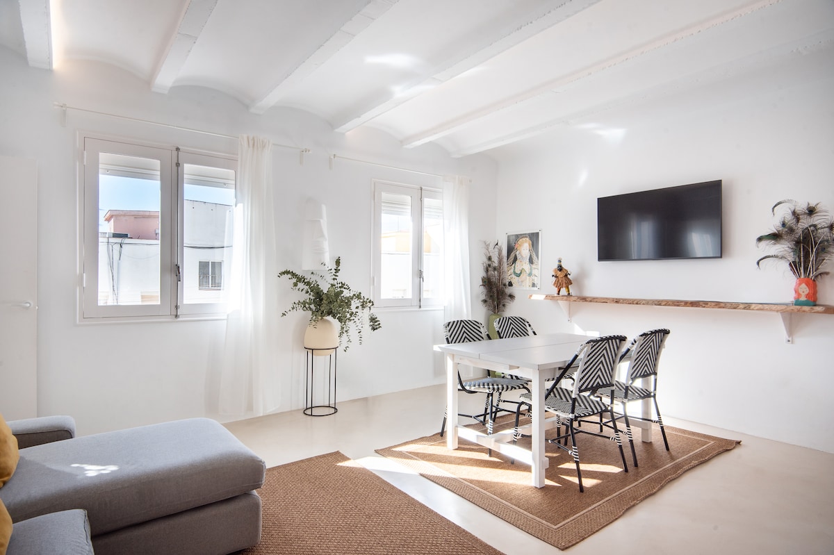 This gorgeous 90m2, bohemian duplex ONE BED apartment has amazing views over the entire city from the large plant -covered terrace. Walking distance from Las Ramblas. There is a bedroom with Queen sized bed downstairs beside a long balcony and another open-plan living area upstairs beside the terrace. There's a smart Tv, free wifi and washing machine and dryer. (please note: it's on the 6th floor and there's NO elevator).Tourist tax (€6.25 per person/per night) IS INCLUDED in the nightly price.