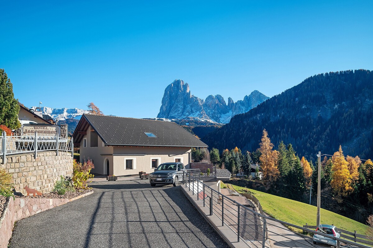 Björt tveggja herbergja íbúð með fallegu útsýni yfir Langkofel, Sellagruppe og Cirspitze, á sólríkum stað, afskekktum frá öllu fjörinu en samt er hægt að komast í þorpið á nokkrum mínútum. Á veturna er skíðarútustoppistöðin aðeins í nokkurra metra fjarlægð og þú ert aldrei á skíðasvæðinu. Börn geta hlaupið um frjáls þar sem enginn vegur liggur framhjá húsinu, þvert á móti, byrjar göngustígur, svokallaður „Via Crucis“, beint fyrir utan útidyrnar.