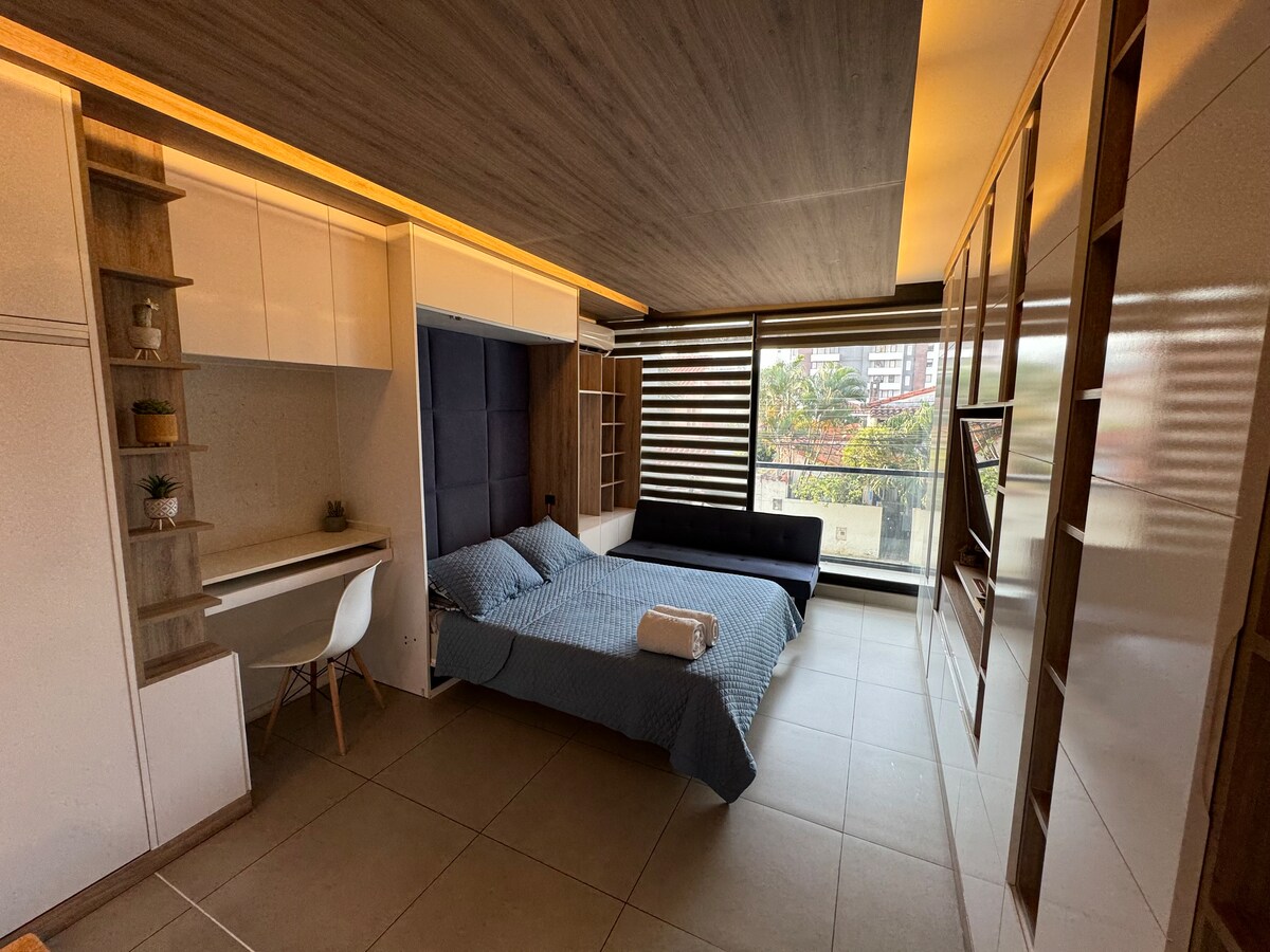 Njóttu einfaldleika þessa rólega stúdíó í hjarta Equipetrol þar sem þú getur verið nálægt veitingastöðum, matvöruverslunum, torgum, kirkjum og viðskiptamiðstöðinni ef þú kemur til vinnu á sama hátt. Í frístundum þínum er stúdíóið með Wify, sjónvarp, Netflix, eldhús, örbylgjuofn, ofn, ísskáp og allt sem þú þarft til að láta þér líða vel inni í byggingunni þar sem þú getur notið sundlaugarinnar, churrasqueras, leikjaherbergisins og coWork